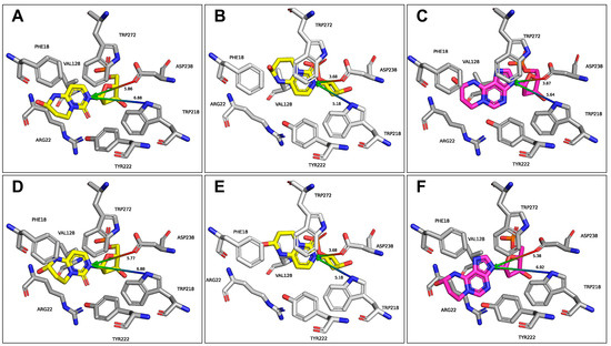 Comparison of the obtained structures with those previously determined for HPA (Figure 6) [21] shows that the orientation of the glycosidic bond is highly similar across the structures. The Tyr22 and Trp272 residues are closer to the modified pyrimidine base, suggesting a more rigid positioning within the active site. Nevertheless, the overall binding pattern remains conserved.