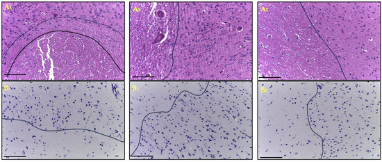 Frontal lobe of the cerebral cortex one day after ischemic stroke in the young (A1,B1), middle (A2,B2) and elderly (A3,B3) age subgroups: hematoxylin and eosin staining (A1–A3); Nissl staining (B1–B3), magn. ×200 (A). The micrographs show the infarction core: below the solid line (A1,B1) and to the left of the solid line (A2,3,B2,3). The dotted line (A1) outside the solid line delimits the area of delayed necrotic transformation of the penumbra. Above (A1,B1) or to the right (A2,3,B2,3) of the solid line is the penumbra zone with neurons in it. Scale bar—100 μm.