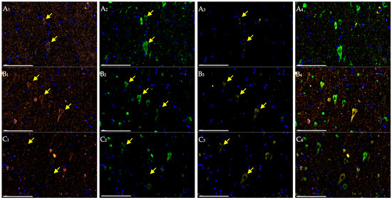 Cerebral cortex of patients one day after ischemic stroke in young (A), middle (B), and elderly (C) groups. Multiplex immunohistochemical staining with antibodies against NeuN (A1–C1; orange fluorescence; Opal 647), NSE (A2–C2; green fluorescence; Opal 488), and Caspase 3 (A3–C3; yellow fluorescence; Opal 540) as well as merged images (A4–C4); magn. ×400. Scale bar—100 μm. Images were acquired using the Vectra® Polaris Automated Quantitative Pathology Imaging System (Akoya Biosciences, Marlborough, MA, USA). In the field of view: positively stained pyramidal neurons (yellow arrows).