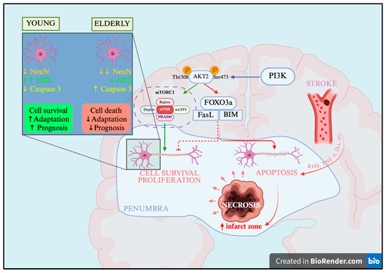 The results of the present study demonstrate significant age-associated alterations in the mechanisms of neuronal death following ischemic stroke. In young patients, neuronal injury in the cerebral cortex can be considered partially compensated: during the first 24 h, a pannecrotic zone forms, while a portion of penumbral neurons retains normal cytology and partial metabolic activity—a state often referred to as “neuronal lethargy” [21]. These neurons exhibit compensatory enhancement of metabolic activity, as evidenced by increased NeuN and NSE expression, together with moderate activation of the caspase cascade, suggesting a potential for reversibility. At the molecular level, penumbral neurons appear to maintain a partial balance between the PI3K/Akt/mTOR and PI3K/Akt/FOXO3a signaling pathways. Collectively, this enables temporary maintenance of protein synthesis, energy metabolism, and partial restriction of apoptosis in the infarct border zone (Figure 5), which may contribute to the preservation of cells in this region, partial prevention of infarct core expansion, and improved clinical outcomes.