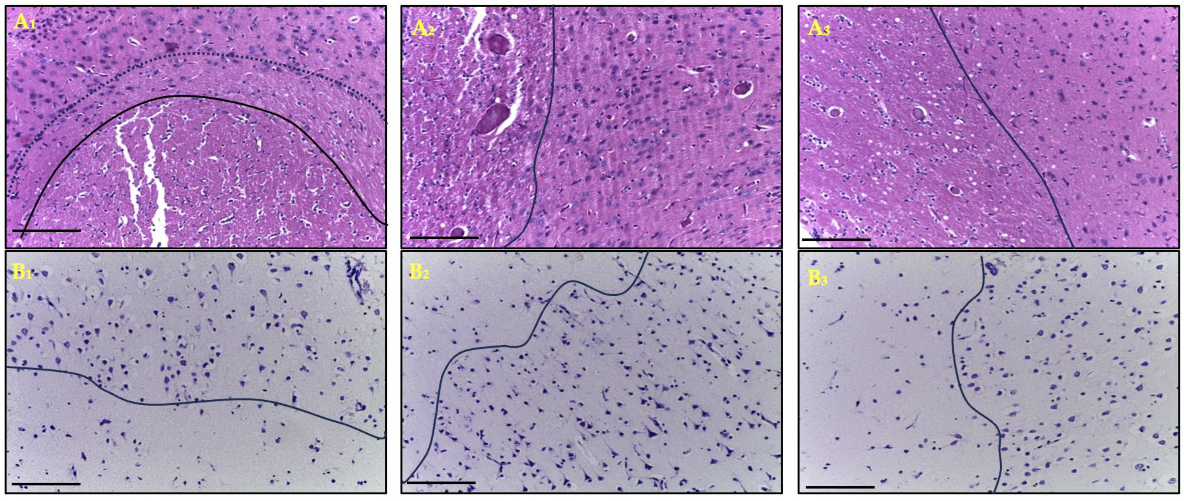 Serial sections (3 μm thick) were prepared from paraffin-embedded brain tissue blocks, deparaffinized, dehydrated, and stained with hematoxylin and eosin according to standard protocols. To identify neurons, one section from each case was stained with cresyl violet using the Nissl method following conventional procedures. The resulting histological slides were examined under a Leica DM2000 light microscope (Leica Microsystems, Wetzlar, Germany) equipped with a digital microphotography system. Neuronal counts were performed in 10 randomly selected microscopic fields at ×400 magnification, separately for the infarct core and the penumbra/infarct border zone. All tissue samples included in the study were confirmed to originate from the ischemic stroke region based on macroscopic and microscopic criteria. All morphological quantifications, including neuronal counts in the intact cortex, the infarct border zone, and the infarct core, were conducted by an investigator who was fully blinded to the patients’ age groups and clinical characteristics to prevent observer bias.