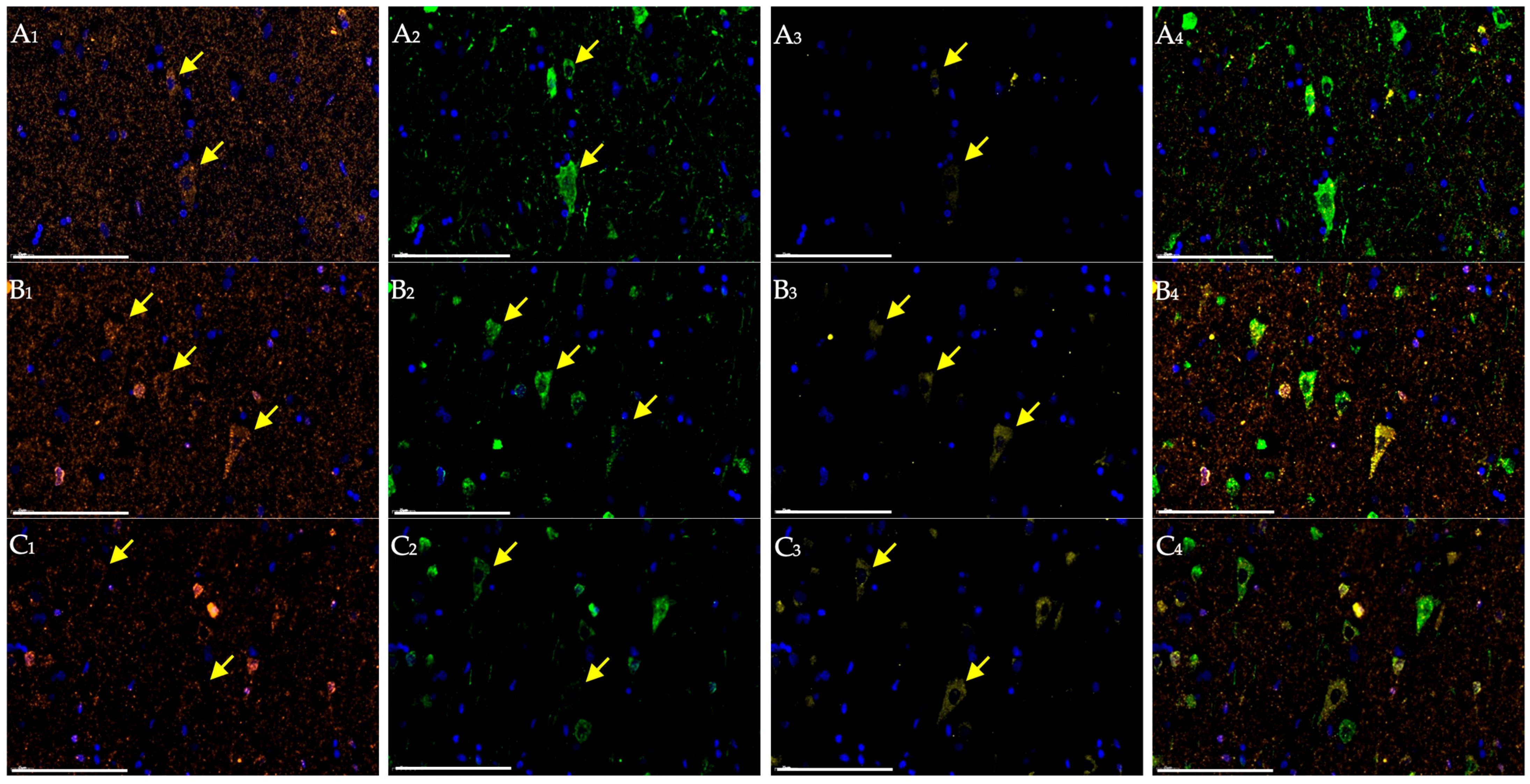 Multiplex immunofluorescence staining was performed using the Opal™ 7-Color Fluorescence Immunohistochemistry Kit (Akoya Biosciences, Marlborough, MA, USA) according to the manufacturer’s protocol. After deparaffinization and rehydration, antigen retrieval was carried out in Tris-EDTA buffer (pH 9.0) using a microwave oven for 15 min, followed by blocking of endogenous peroxidase activity. First staining round. Sections were incubated for 60 min with the primary antibody against NeuN (Clone EPR12763, Abcam, Cambridge, UK; 1:500). After washing, slides were treated with the Horseradish Peroxidase (HRP) Ms+Rb polymer for 10 min, followed by incubation with the Opal 647 fluorophore for 10 min. Bound primary and secondary antibodies were then removed by repeated microwave treatment in Tris-EDTA buffer (pH 9.0) as described above. Subsequent staining rounds. The procedure was repeated with antibodies against NSE (Clone EPR12483, Abcam, Cambridge, UK; 1:500) and Caspase 3 (Clone 9H19L2, Thermo Fisher Scientific, Waltham, MA, USA; 1:500). After incubation with the HRP Ms+Rb polymer for 10 min, the slides were treated with Opal 488 and Opal 540 fluorophores, each for 10 min. Nuclei were counterstained with DAPI for 5 min, and the sections were mounted using ProLong™ Diamond Antifade Mountant (Thermo Fisher Scientific, Waltham, MA, USA). Visualization and quantitative analysis. Multispectral images were acquired using the Vectra® Polaris Automated Quantitative Pathology Imaging System (Akoya Biosciences, Marlborough, MA, USA) at 20× magnification. Whole-slide images were processed and analyzed using inForm® Image Analysis Software v2.6 (Akoya Biosciences, Marlborough, MA, USA).