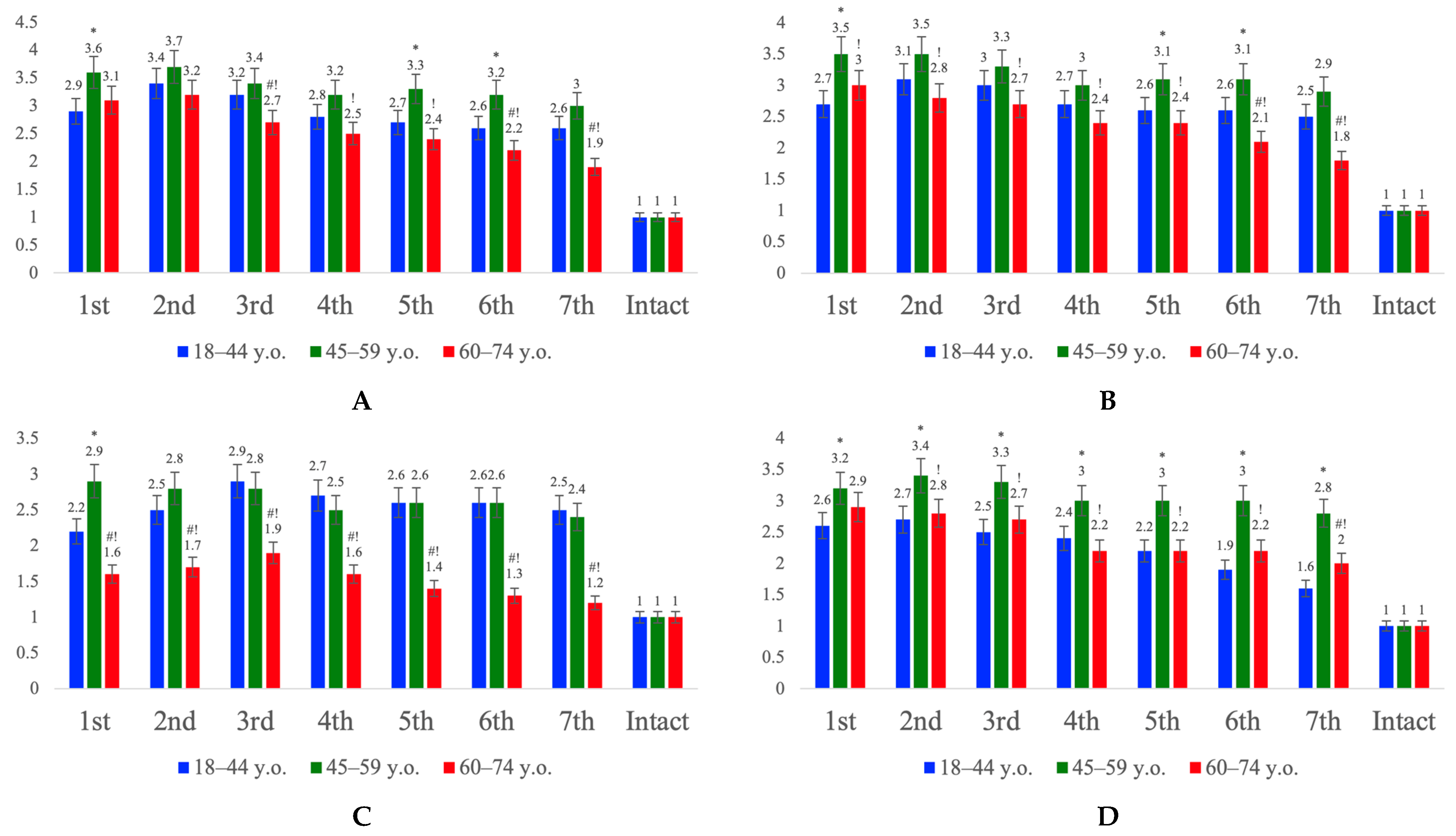 A total of 154 patients were enrolled, divided into three age-based cohorts: young (n = 38, mean age 34.8 ± 4.2 years), middle (n = 51, 51.1 ± 4.8 years), and elderly (n = 65, 69.3 ± 5.4 years). The sex distribution did not differ significantly across groups (