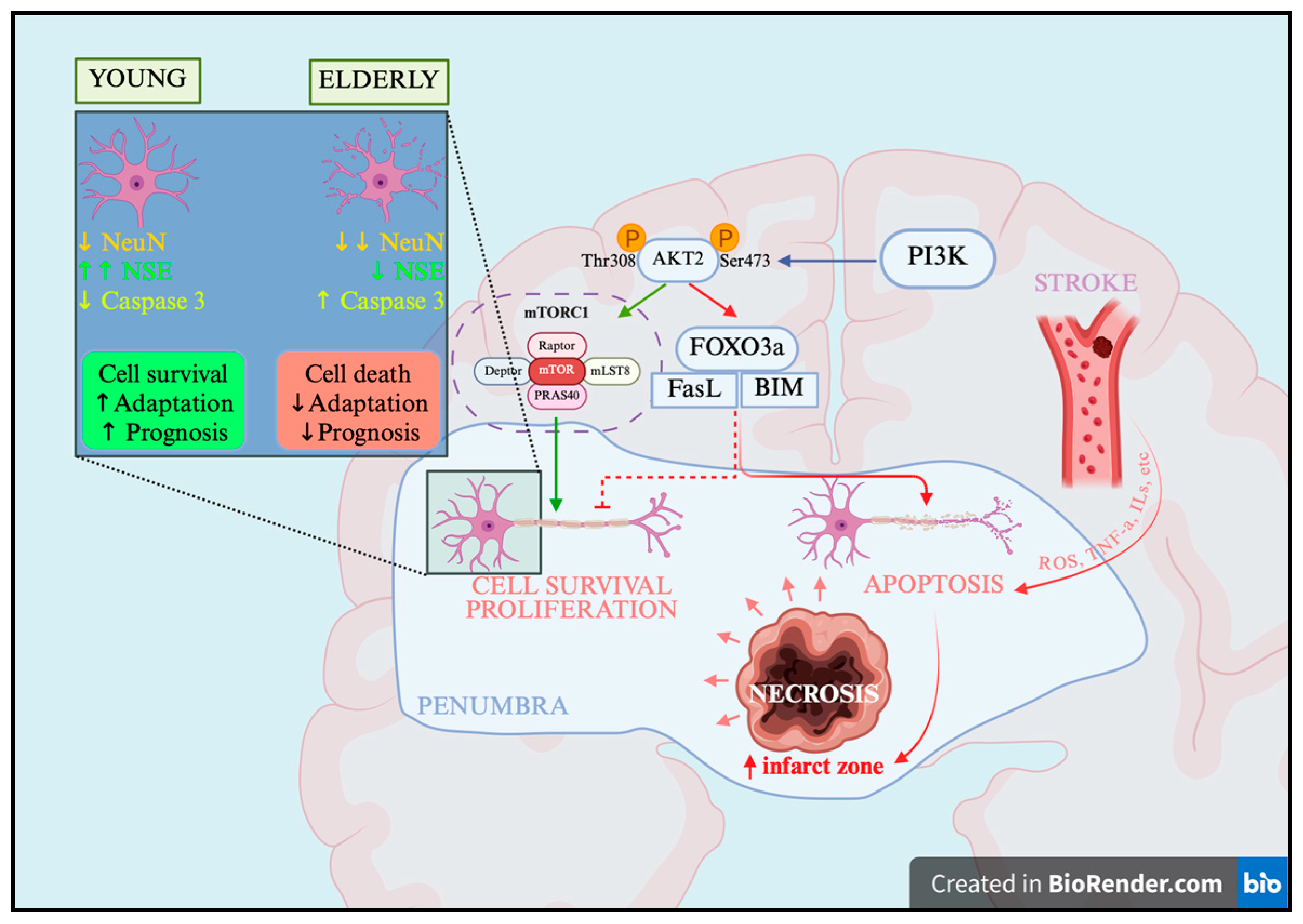 MTOR, suggesting a regulatory shift toward hyperactivation of the PI3K/Akt/FOXO3a axis. This redistribution likely reflects age-associated attenuation of pro-survival mechanisms, accompanied by a predominance of autophagic, pro-apoptotic, and proinflammatory effects resulting from dysregulated PI3K/Akt/FOXO3a signaling, which may contribute to increased neuronal vulnerability to ischemic injury in elderly patients.