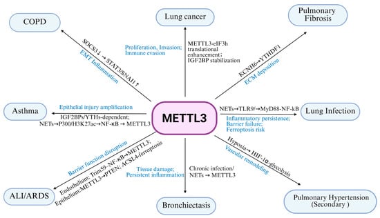 METTL3 is emerging as a critical epigenetic regulator in various pulmonary infectious and inflammatory diseases. By modulating m6A RNA methylation in response to bacterial toxins, viral infections, sepsis, and radiation, METTL3 influences immune signaling, cell death, and tissue remodeling. These findings highlight its potential as a therapeutic target in conditions such as pneumonia, COVID-19, acute lung injury (ALI), ARDS, and radiation-induced lung damage.