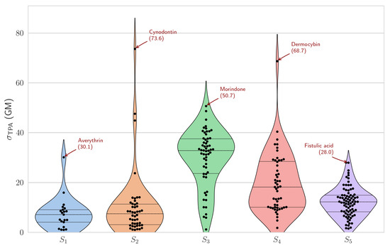 The calculated D1 values range from a minimum of 0.0624 (ziganein) to a maximum of 0.1268 (cynodontin), with a mean value of 0.1069 across all 97 molecules. Whilst the strict single–reference regime traditionally flags D1 values ≥ 0.05 as concerning [17,18], this limit is often considered overly restrictive. Köhn et al. [19] proposed a limit of 0.10–0.15 as a more appropriate threshold for the RI–CC2. Given that all D1 diagnostics in this study fall within or below the acceptable threshold range, the calculated properties related to two–photon absorption can be considered quantitatively reliable, allowing direct comparison of both absolute values and relative trends. Moreover, the consistency of the results is further supported by the low standard deviation (±0.0111), reinforcing the assumption that systematic errors are uniform across the dataset.
