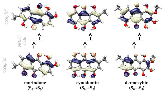 Natural transition orbital analysis confirms that the exceptional TPA responses of cynodontin, dermocybin, and morindone arise from highly directional charge–transfer mechanisms, as evidenced by spatial separation between hole and particle NTOs and extreme transition dipole anisotropy (longitudinal components reaching −380.7 a.u.); the excited states exhibit high configurational purity (82.5–94.2% single–excitation character), validating the single–reference treatment. The systematic structure–property investigation establishes clear design principles demonstrating that heavy–atom–free anthraquinones can achieve reasonable values through rational functionalisation strategies.