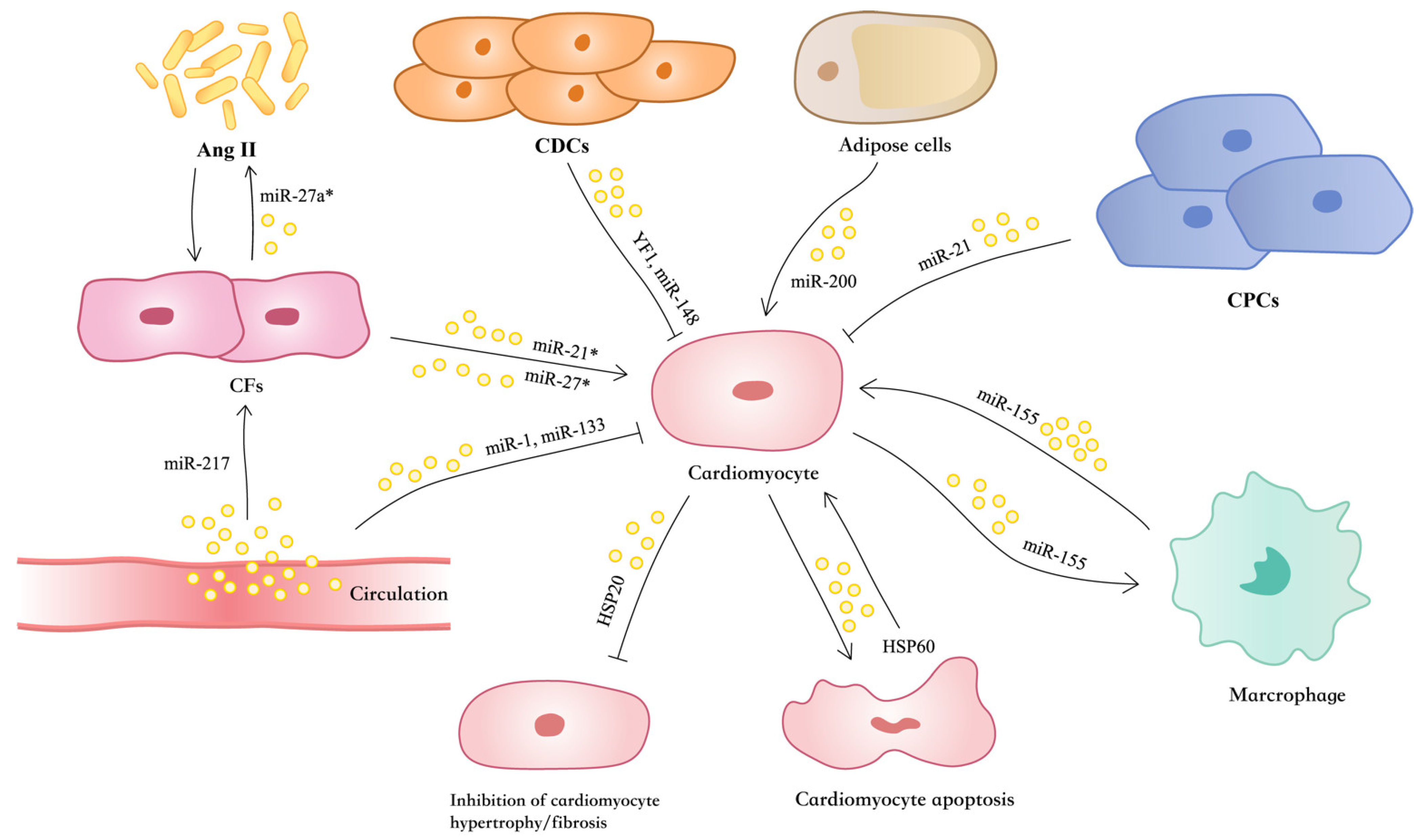 | CDCs/Human | miR-148a | Inhibit GP130 Suppress STAT3/ERK1/2/AKT pathway | Cardiac hypertrophy ↓ | [141] |