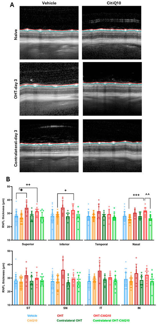 Representative cross-sectional OCT scans (A) and retinal nerve fiber layer (RNFL) thickness measured by OCT (B) in the different experimental groups at 3 days post-induction. The analyzed sectors were SN: supero-nasal; ST: supero-temporal; IN: infero-nasal; IT: infero-temporal. Statistical significance indicators: * p < 0.05 vs. vehicle; + p < 0.05; ++ p < 0.01; +++ p < 0.001 vs. CitiQ10; ^^ p < 0.01 OHT vs. Contralateral-CitiQ10. Two-way ANOVA was used. Abbreviations: OCT (optical coherence tomography); OHT (ocular hypertension); Citicoline + Coenzyme Q10 (CitiQ10); retinal nerve fiber layer (RNFL); supero-nasal (SN); supero-temporal (ST); infero-nasal (IN); infero-temporal (IT).