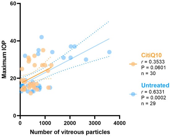 The correlation between the maximum IOP and the number of vitreous particles was analyzed in the untreated groups and the CitiQ10-treated groups.