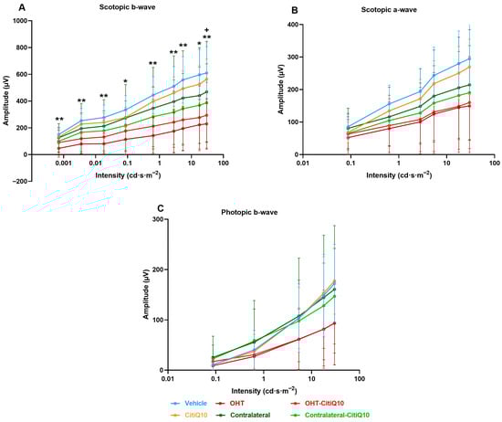 Intensity–amplitude graph of the scotopic b-wave (A), scotopic a-wave (B), and photopic b-wave (C) across experimental groups 7 days post-induction. Each line represents one experimental group, with mean amplitude and standard deviation (SD) shown at each stimulus intensity. Statistical significance indicators. Statistical significance indicators: **** p < 0.0001; *** p < 0.001; ** p < 0.01; * p < 0.05 vs. vehicle, + p < 0.05 vs. CitiQ10. Abbreviations: SD (standard deviation); OHT (ocular hypertension); Citicoline + Coenzyme Q10 (CitiQ10); microvolts (μV); candela (cd); seconds (s); meters (m).