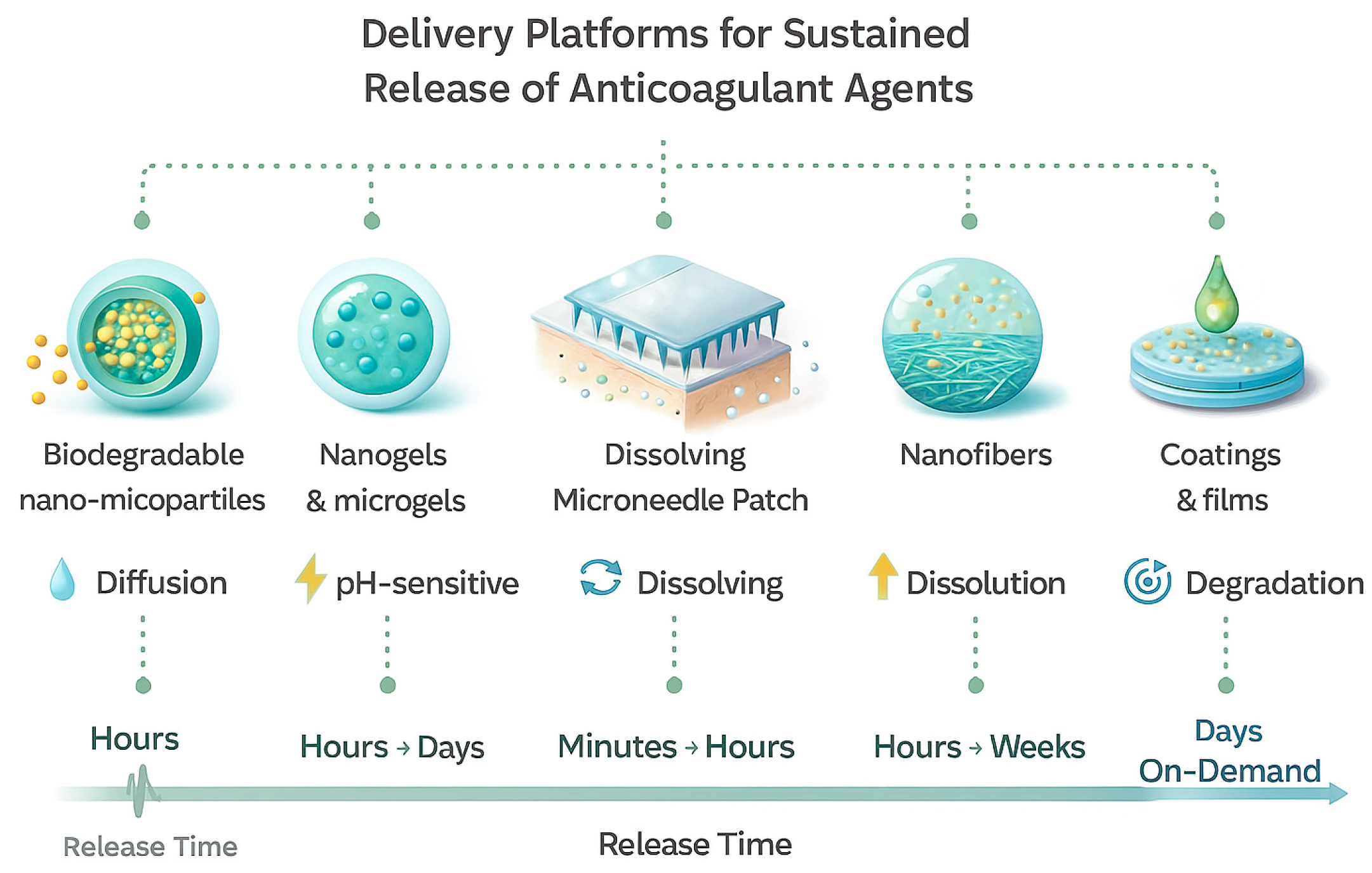 | PLGA/PEG microspheres /nanoparticles | Apixaban/Rivaroxaban (inhibitory Xa) | Biphasic; PLGA hydrolysis + diffusion (PEG modifies kinetics) by 10–20 days | Synergy with heparin; improved bioavailability; in vivo rat/rabbit models; potential for therapy: AF-related stroke, prevention of venous thrombosis, long-term treatment, and local control of coagulation | Controlled release; stability | [147,151,153] |
