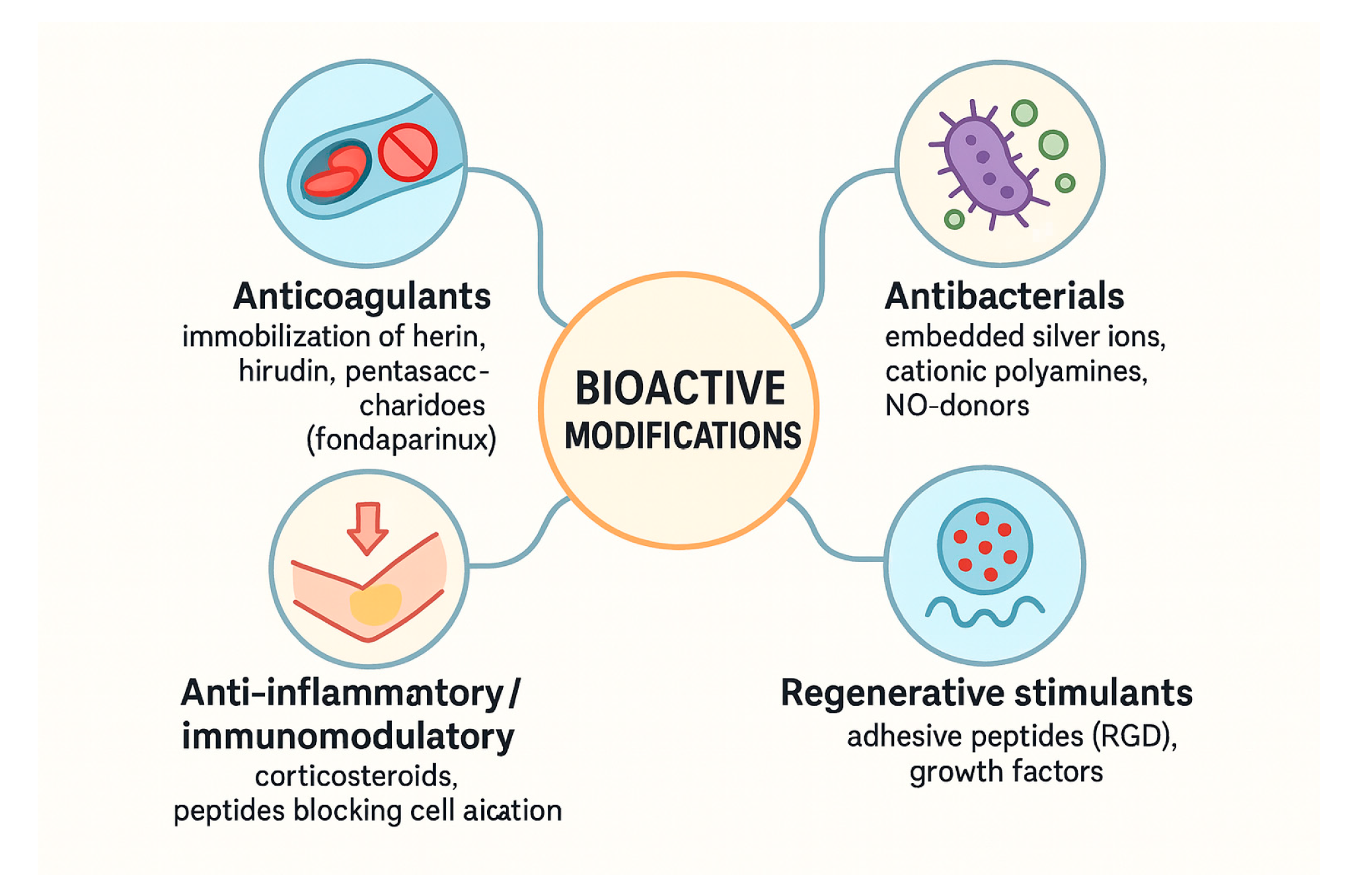 | Optimal applications | Low-cost coatings, wound dressings, growth-factor release systems | Vascular grafts, implants, and long-term stable coatings | Bioactive coatings requiring preserved heparin activity | Advanced brush-type coatings, responsive interfaces, and intelligent biomaterials |