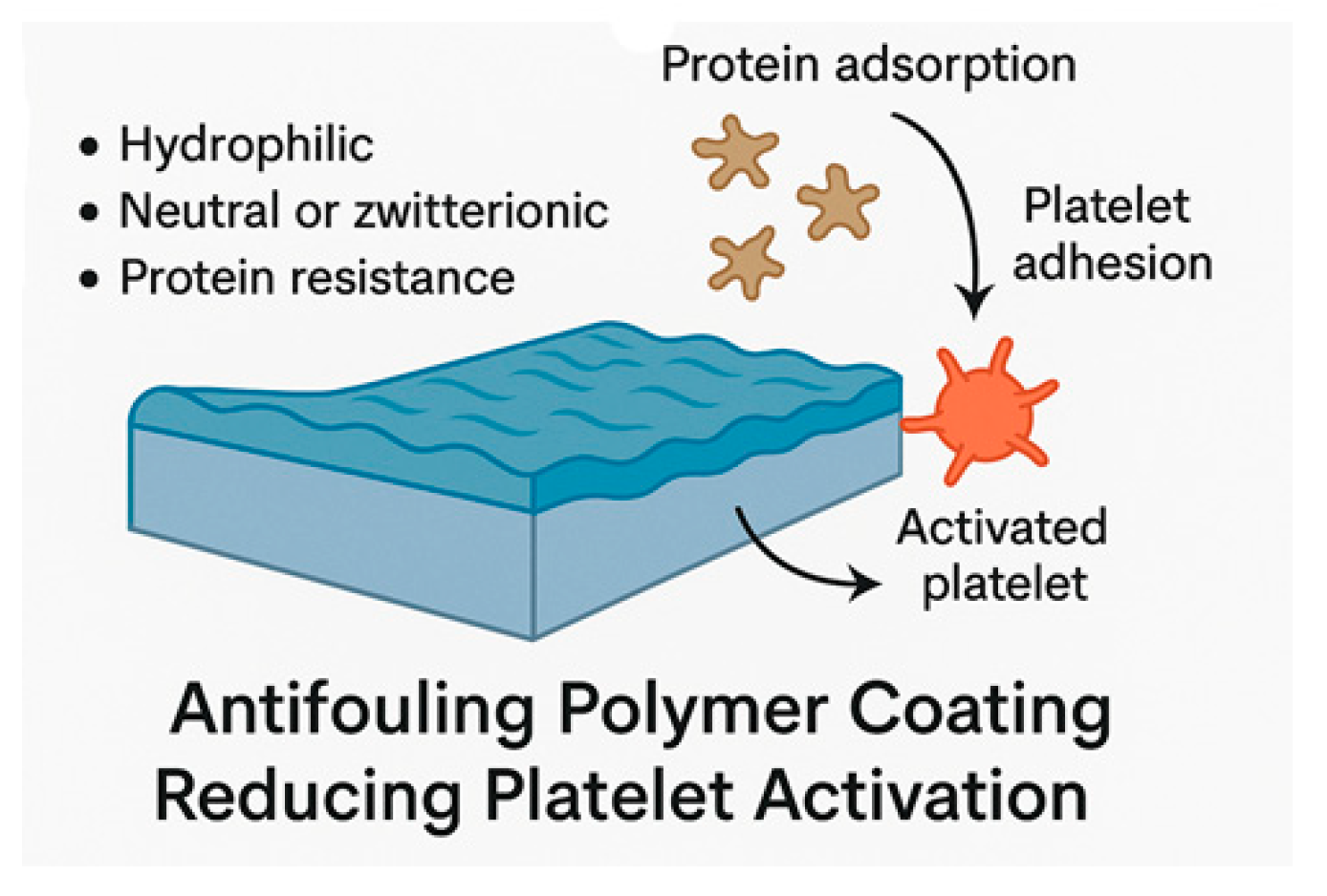 | Zwitterionic polymer coatings | Surface-grafted or bulk-modified poly(zwitterions) (e.g., sulfobetaine, carboxybetaine, phosphorylcholine) form a strongly hydrated, charge-neutral layer that sterically and electrostatically repels plasma proteins and cells. | Very low adsorption of fibrinogen and other plasma proteins, strong reduction in platelet adhesion/activation, and complement activation; improved hemocompatibility under whole blood and plasma flow. | [199,208,209,210,211] |