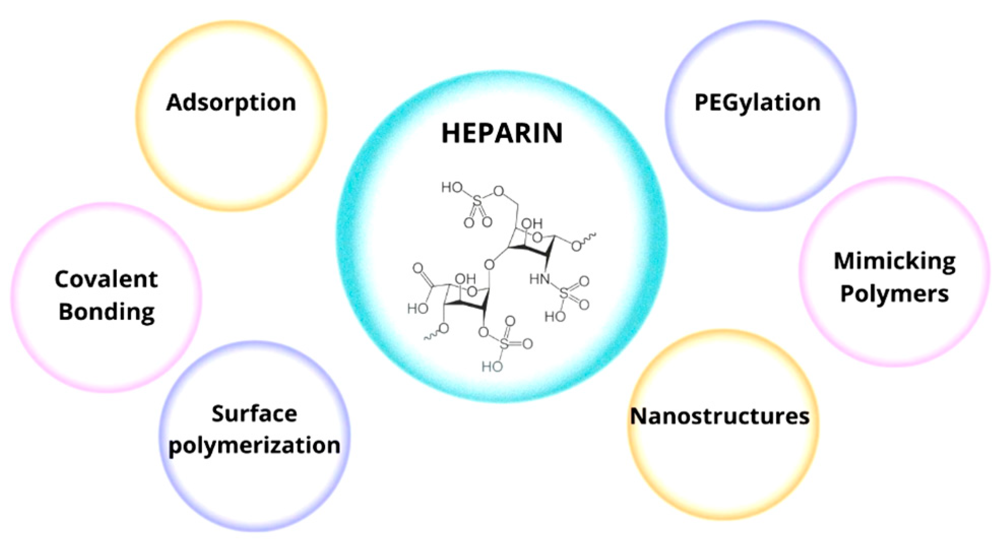 | Heparin-b-PEG conjugate (oxime ligation) | Covalent pegylation of heparin (end-on) | Modifying heparin to prolong half-life and reduce side effects | [238] |
