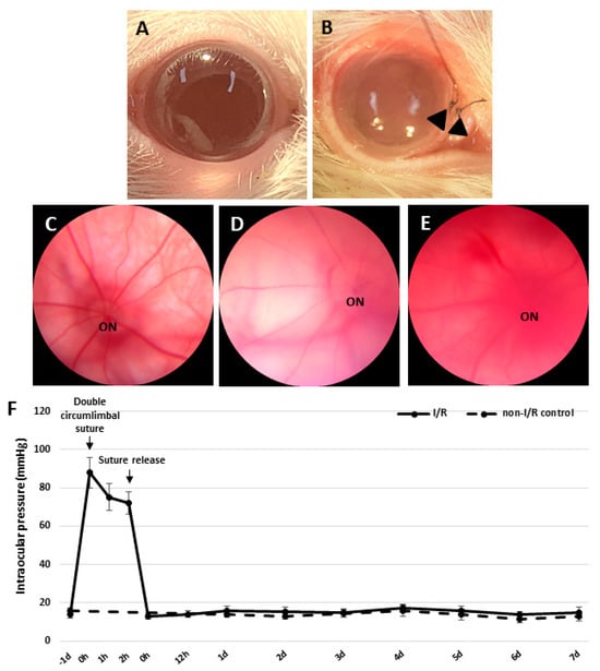 Development of the retinal ischemia/reperfusion model using double circumlimbal sutures. (A) The control eye exhibited no gross abnormalities, while double circumlimbal suturing (black arrowheads) rendered the anterior segment pale, suggestive of ischemia (B). Fundus photographs showed that retinal circulation was impaired in double circumlimbal sutured eyes (C) compared to that of control eyes (D). After suture release, reactive hyperemia, possibly of the retina and choroid, was observed, indicating apparent reperfusion (E). The intraocular pressure (IOP) was acutely elevated from baseline immediately after the suturing (89 ± 8 mmHg) until the release of sutures; then the IOP fell significantly to 13 ± 2 mmHg and remained within the normal range up to 1 week after surgery (F). ON: optic nerve.