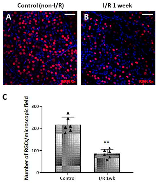 Retinal whole-mount images of control and retinal ischemia/reperfusion (I/R) eyes immunostained for BRN-3a (red) 1 week after double circumlimbal suturing. Immunostaining for BRN-3a 1 week after retinal I/R revealed a decreased number of retinal ganglion cells (RGCs) in retinal I/R eyes (B) compared to control eyes (A), with a statistically significant difference (C). Representative images shown in the figure were photographed from the middle region (2 mm from the optic disc) of the retinal whole-mounts. ** p < 0.01. For each group, six biological replicates were included for data analysis (n = 6 per group). RGCs were counted in eight peripheral, five mid-region, and three central regions of the whole mounts. The data are means ± standard errors of the means. Scale bar, 40 µm.