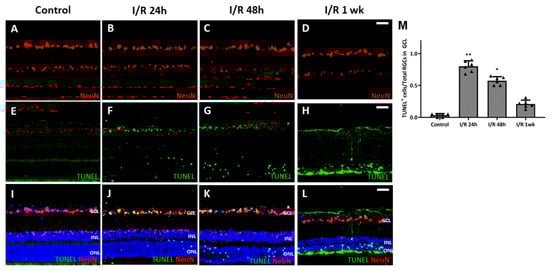 Results from terminal deoxynucleotidyl transferase dUTP nick-end labeling (TUNEL) assay using retinal cross-sections from control and retinal ischemia/reperfusion (I/R) eyes. (A,E,I) No TUNEL-positive retinal ganglion cells (RGCs) were evident in control eyes, but many TUNEL-positive RGCs were apparent 24 h after retinal I/R injury (B,F,J). TUNEL-positive cells were visible up to at least 48 h after the I/R insult with decreasing numbers (C,G,K). One week after the insult, most of the TUNEL-positive cells were in the outer nuclear layer (D,H,L). These changes were significant compared to non-I/R control eyes (M). * p < 0.05. ** p < 0.01. Scale bar, 40 µm. For each group, six biological replicates were included for data analysis (n = 6 per group), and the average number of cells from 3 retinal sections for each eye was used for the analysis. Data are means ± standard errors of the means.