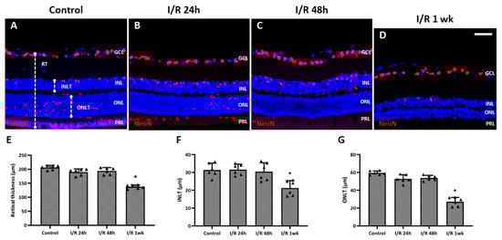 Changes in thickness of the total retina, inner nuclear layer, and outer nuclear layer of eyes after retinal ischemia/reperfusion (I/R) insult. (A) Total retinal thickness, inner nuclear layer thickness (INLT), and outer nuclear layer thickness (ONLT) were measured from retinal cross-sections. From cross-sectional images, no apparent changes were detected for retinal thickness (RT) after 24 h (B) and 48 h (C) after the I/R insult compared to control eyes (A), while significant decreases in the total RT, INLT, and ONLT were detected at 1 week after the I/R insult (D–G). * p < 0.05 vs. control. Scale bar, 40 µm. For each group, six biological replicates were included for data analysis (n = 6 per group), and the average value from 3 retinal sections for each eye was used for the analysis. Data are means ± standard errors of the means.