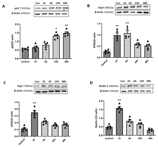 For further quantification analysis for autophagy-related markers upon retinal I/R insult, WB analyses for various autophagy markers were performed (Figure 7). Ubiquitin-binding protein p62 plays an important role in autophagy by attaching substrates to LC3 for autophagic digestion. While LC3-II levels increased early, p62 levels remained relatively unchanged at 1 and 6 h after retinal I/R insult. Subsequently, p62 levels gradually increased to a significant level at 24 and 48 h after double-circumlimbal suturing. This stable p62 level in the early phase, followed by its accumulation in the later phase despite the initial LC3-II increase, suggests that autophagic flux may become progressively impaired after the initial insult. In addition, expression levels of ATG proteins including ATG4 and ATG 7 were analyzed. ATG4 and ATG7 promote the lipidation and conjugation of LC3 with phosphatidylethanolamine, respectively. Both ATG4 and ATG7 were significantly elevated at early time points and at 1 and 6 h after retinal I/R insult, which decreased to near control levels 24 to 48 h after the injury. ATG6, also known as Beclin-1, plays a crucial role in autophagosome formation. Similar to other ATG proteins, a significant increase in the Beclin-1 level was detected 1 h after the surgery, followed by a gradual decrease up to 48 h, indicating an initial induction of the autophagic machinery early after retinal I/R development.