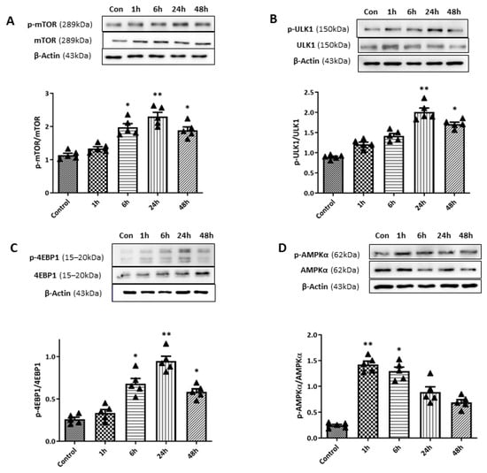 To examine the relationship between the mTOR pathway and the observed autophagy induction during the early period after retinal I/R, we conducted WB analyses of phosphorylated mTOR (p-mTOR) (Figure 8). A gradual increase in the p-mTOR/mTOR ratio was observed up to 24 h after the retinal I/R insult, reaching statistical significance after 6 (p < 0.05), 24 (p < 0.01), and 48 h (p < 0.01) after the surgery. During autophagy suppression, p-mTOR inhibits Unc51-like kinase 1 (ULK1) and 4E-binding protein 1 (4EBP1) via their phosphorylation; these are two main downstream targets of the mTOR signaling pathway. Therefore, we further assessed p-ULK1 and p-4EBP1 levels. Similar patterns were observed for p-ULK1 and p-4EBP1 levels, which were significantly elevated at 6, 24, and 48 h after the surgery. On the other hand, the expression level of AMP-activated kinase (AMPK), which is inversely correlated with mTOR activity, was also investigated by WB analyses. The phosphorylated AMPK level showed a significant increase 1 h after retinal I/R insult, which decreased over the 48 h period following surgery; thus, the opposite time-dependent pattern was exhibited by phosphorylated AMPK levels compared to that observed for the p-mTOR level.