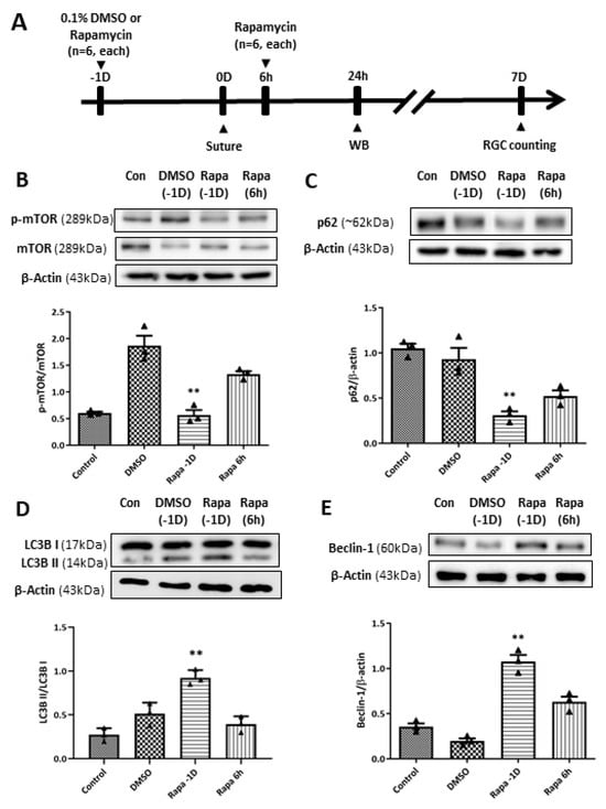 To further investigate the effect of autophagy induction on RGC survival in our retinal I/R rat model, we performed intravitreal rapamycin injection at different time points according to the retinal I/R insult: 1 day before (day-1) and 6 h after surgery (Figure 9). Intravitreal 0.1% dimethyl sulfoxide (DMSO) injection was performed on day-1 for the vehicle control group. WB analyses showed that mTOR pathway activity was significantly reduced by intravitreal rapamycin administration when it was given a day before suture placement compared to DMSO-injected retinal I/R eyes. In addition, autophagy induction was significantly upregulated upon intravitreal rapamycin injection given 1 day before surgery compared to intravitreal DMSO-injected eyes, as shown by p62, LC3B, and Beclin-1 expression.