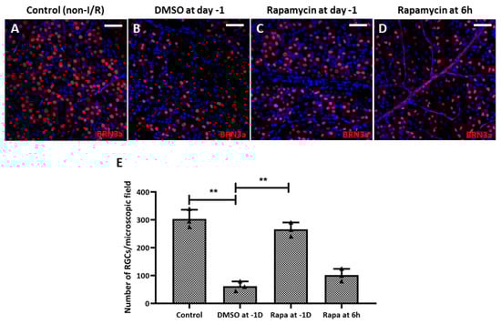 Intravitreal injection of rapamycin at 1 day before double circumlimbal suturing enhanced retinal ganglion cell (RGC) survival. (A,B,E) Whole-mount images immunostained for BRN-3a exhibited a significantly lower number of RGCs in retinal ischemia/reperfusion (I/R) eyes with intravitreal 0.1% dimethyl sulfoxide (DMSO) injection given 1 day before double circumlimbal suture compared to non-I/R eyes. (C–E) Retinal I/R eyes with intravitreal rapamycin injection performed at day 1 showed a significantly increased number of RGCs compared to eyes with 0.1% DMSO injection. However, eyes with intravitreal rapamycin injection performed 6 h after the insult did not show a significant difference in RGC numbers compared to DMSO-injected eyes. Representative images shown in the figure were photographed from the middle region (2 mm from the optic disc) of the retinal whole-mounts. For each group, three biological replicates were included for data analysis (n = 3 per group). RGCs were counted in eight peripheral, five mid-region, and three central regions of the whole mounts. Data are expressed as mean ± standard errors of the means. ** p < 0.01. Scale bar, 40 µm.
