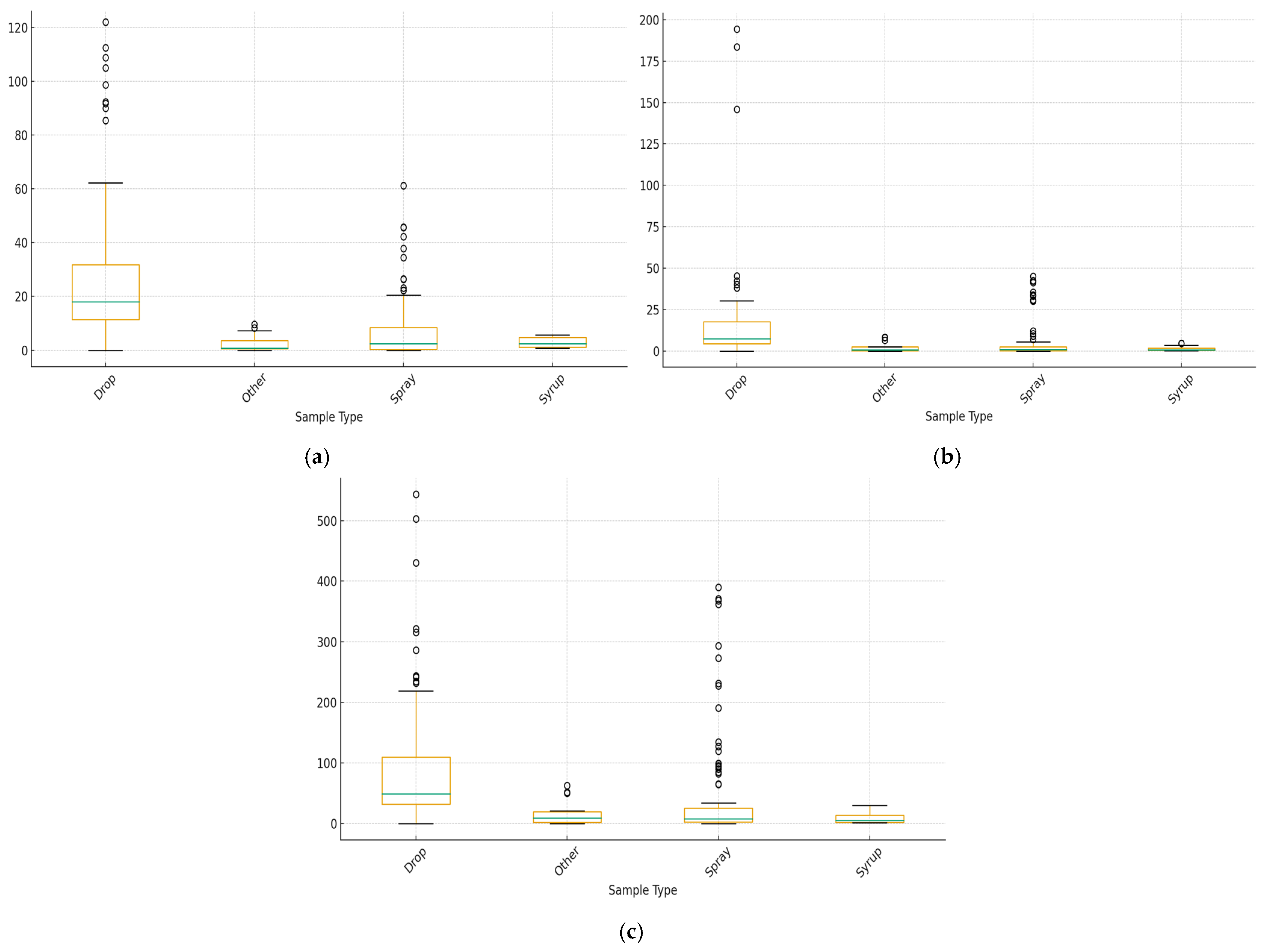 | Not Specified on the Label | Spray | 117 | 5.8 ± 0.7 | 90.6 ± 4.1 | |