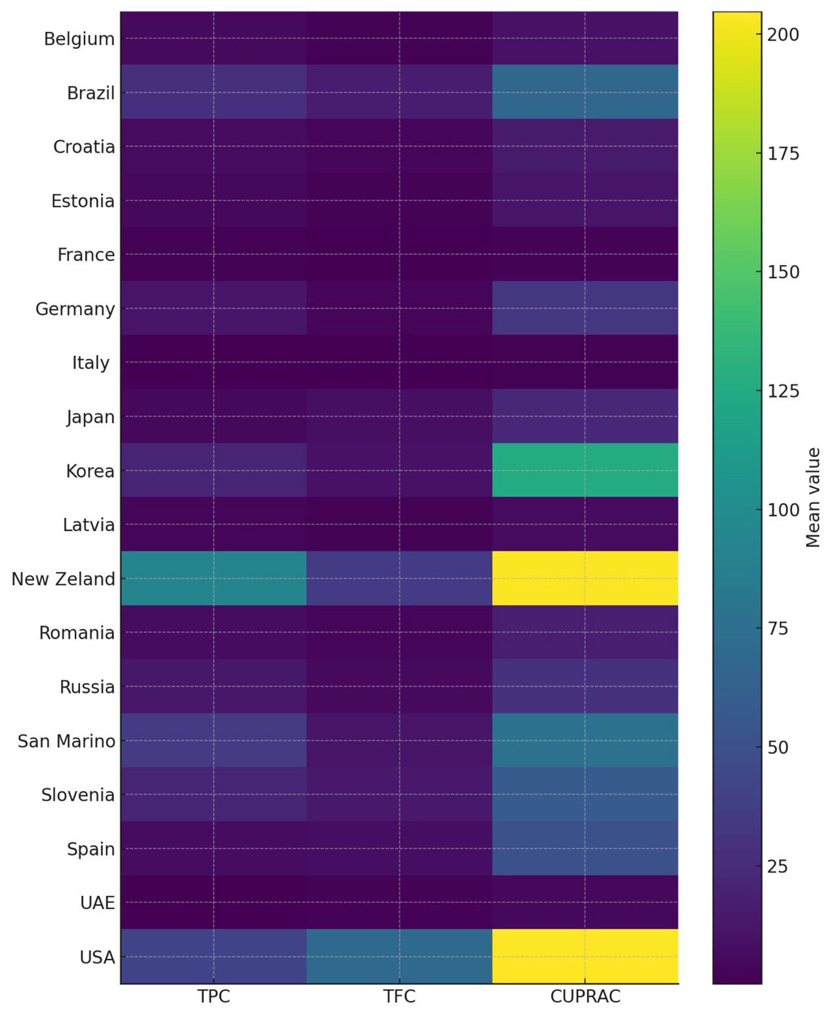 | USA | 3 | 0.7 ± 0.1 | 101.2 ± 10.3 | 1.1 ± 0.2 | 174.5 ± 25.5 | 17.9 ± 1.9 | 492.3 ± 57.3 |