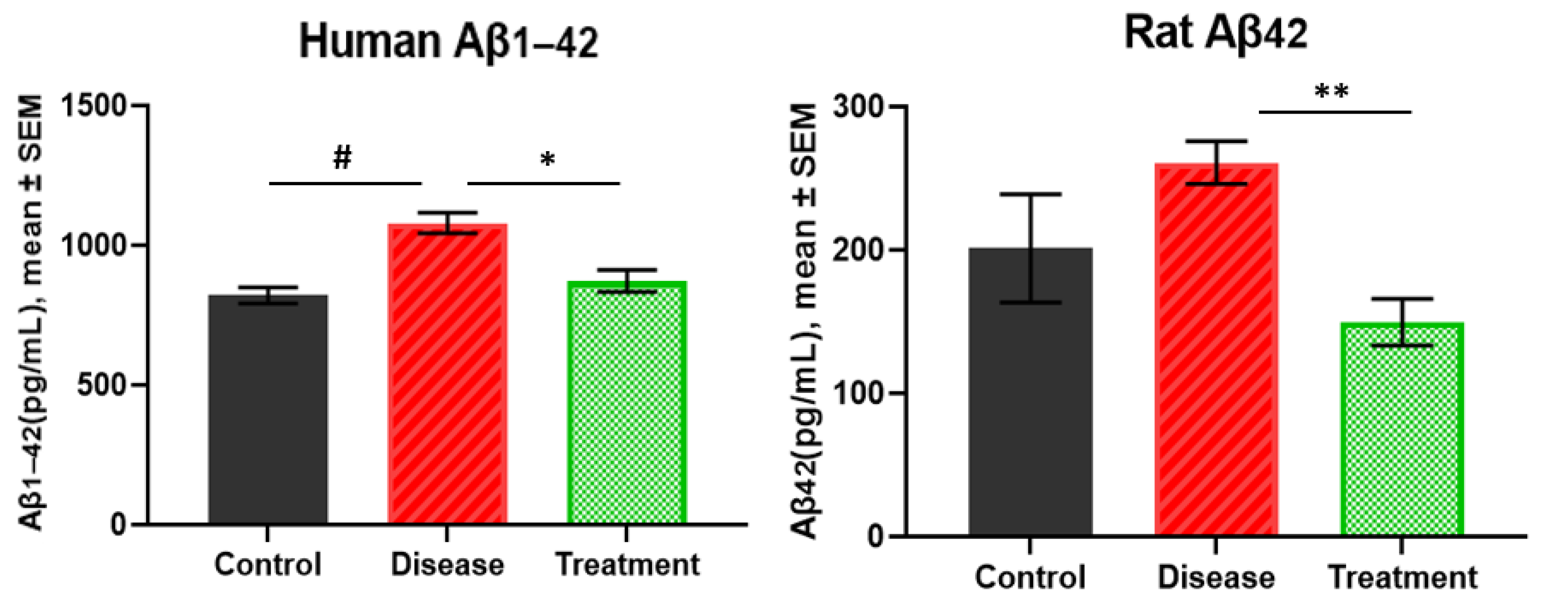 2.1. Human Amyloid β1-42 and Rat Amyloid β42 Levels in Brain