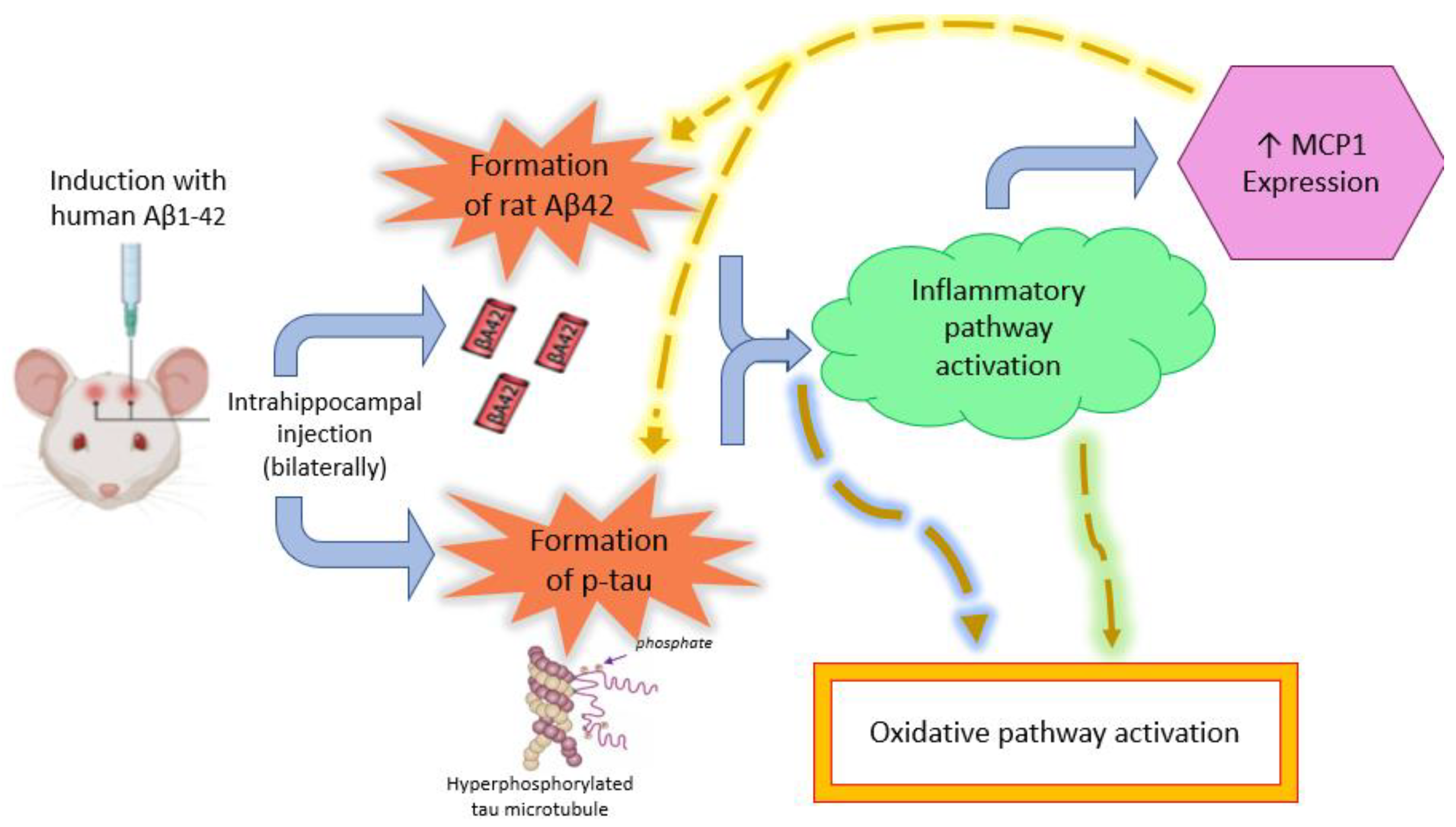 - Calvo-Flores Guzmán, B.; Elizabeth Chaffey, T.; Hansika Palpagama, T.; Waters, S.; Boix, J.; Tate, W.P.; Peppercorn, K.; Dragunow, M.; Waldvogel, H.J.; Faull, R.L.M.; et al. The Interplay Between Beta-Amyloid 1-42 (Aβ1-42)-Induced Hippocampal Inflammatory Response, p-tau, Vascular Pathology, and Their Synergistic Contributions to Neuronal Death and Behavioral Deficits. Front. Mol. Neurosci. 2020, 13, 522073. [Google Scholar] [CrossRef] [PubMed]