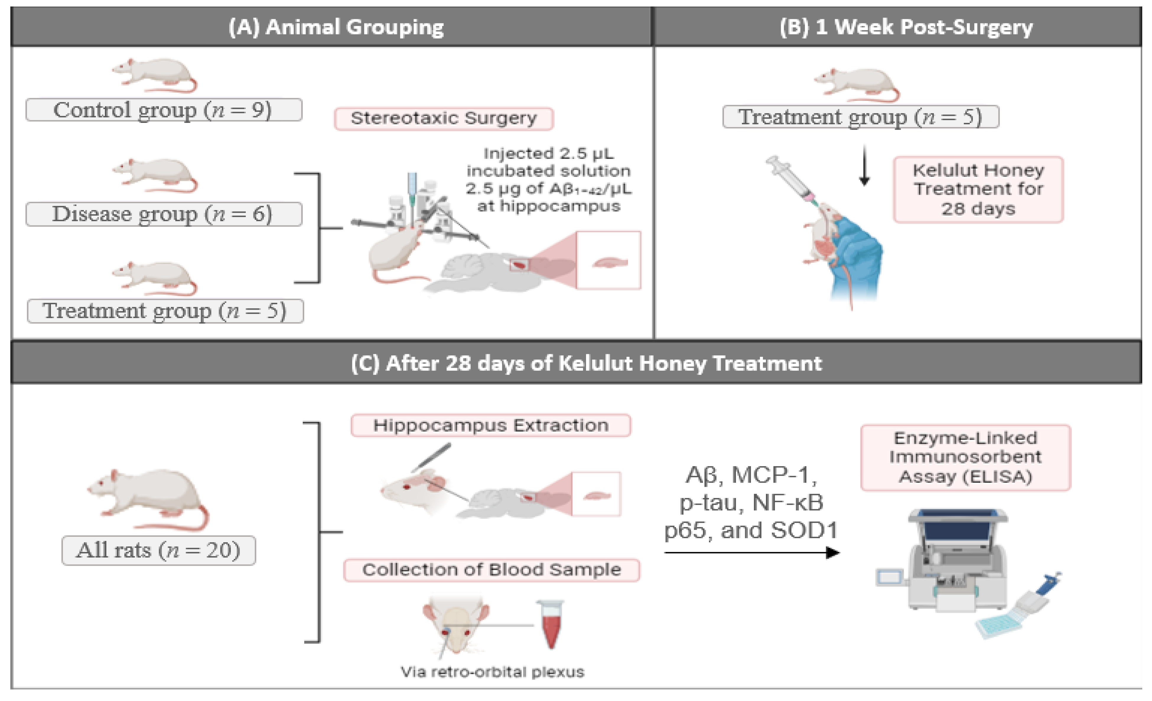 Shaikh, A.; Ahmad, F.; Kumar, J.; Teoh, S.L.; Yahaya, M.F. Early Molecular Biomarkers in an Amyloid-β-Induced Rat Model of Alzheimer’s Disease: Effects of Kelulut Honey. Int. J. Mol. Sci. 2026, 27, 1059. https://doi.org/10.3390/ijms27021059