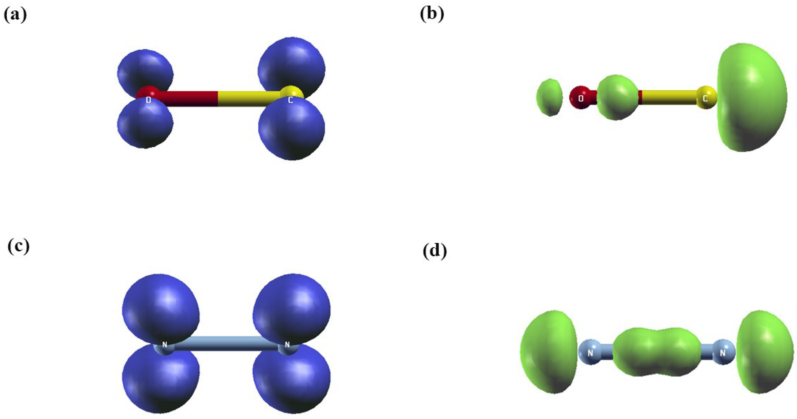 On the other hand, the excitonic electron and hole densities of the CO molecule are predominantly localized on the oxygen and carbon atoms, respectively. This spatial separation reveals a clear charge-transfer excitation from carbon to oxygen, reflecting the difference in electronegativity between the two atoms. In contrast, for the N2 molecule, both the electron and hole densities are symmetrically distributed over the two nitrogen atoms, consistent with its homonuclear and highly symmetric () character. Unlike CO, no net charge transfer occurs upon excitation, as the electronic transition is delocalized and equally shared between the two nitrogen atoms.