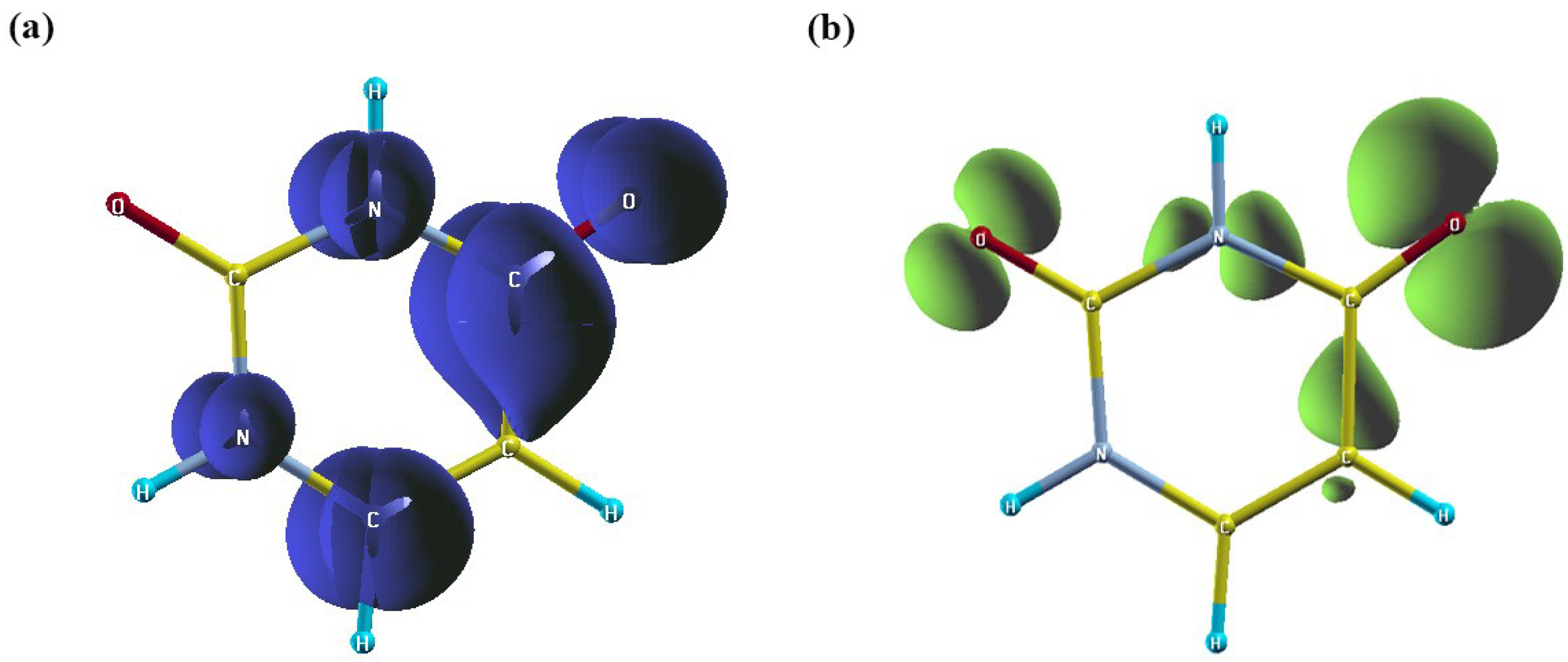Figure 3. It can be seen that the excitonic electron density is mainly localized in the C=O bond region of uracil and slightly extends toward the adjacent C-N bond, consistent with the population of the antibonding