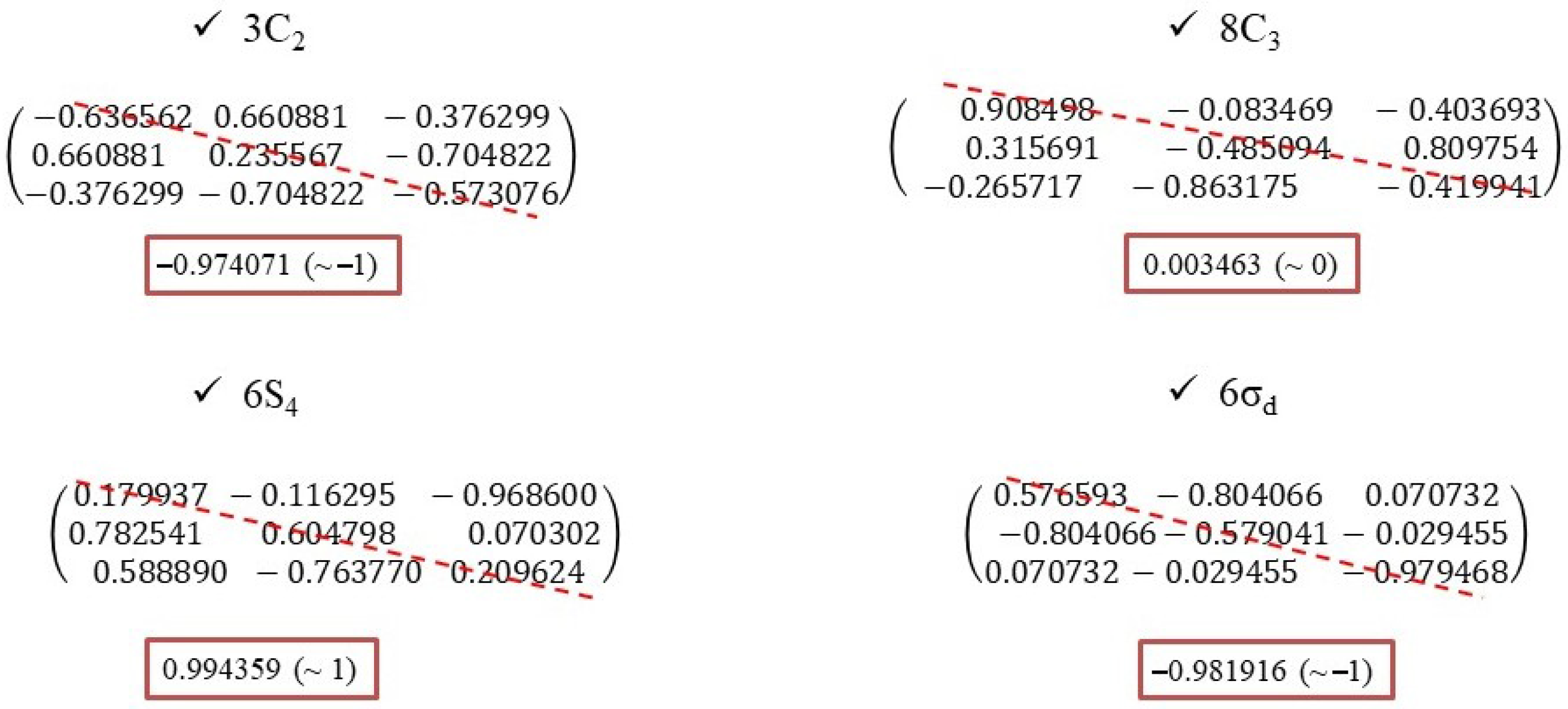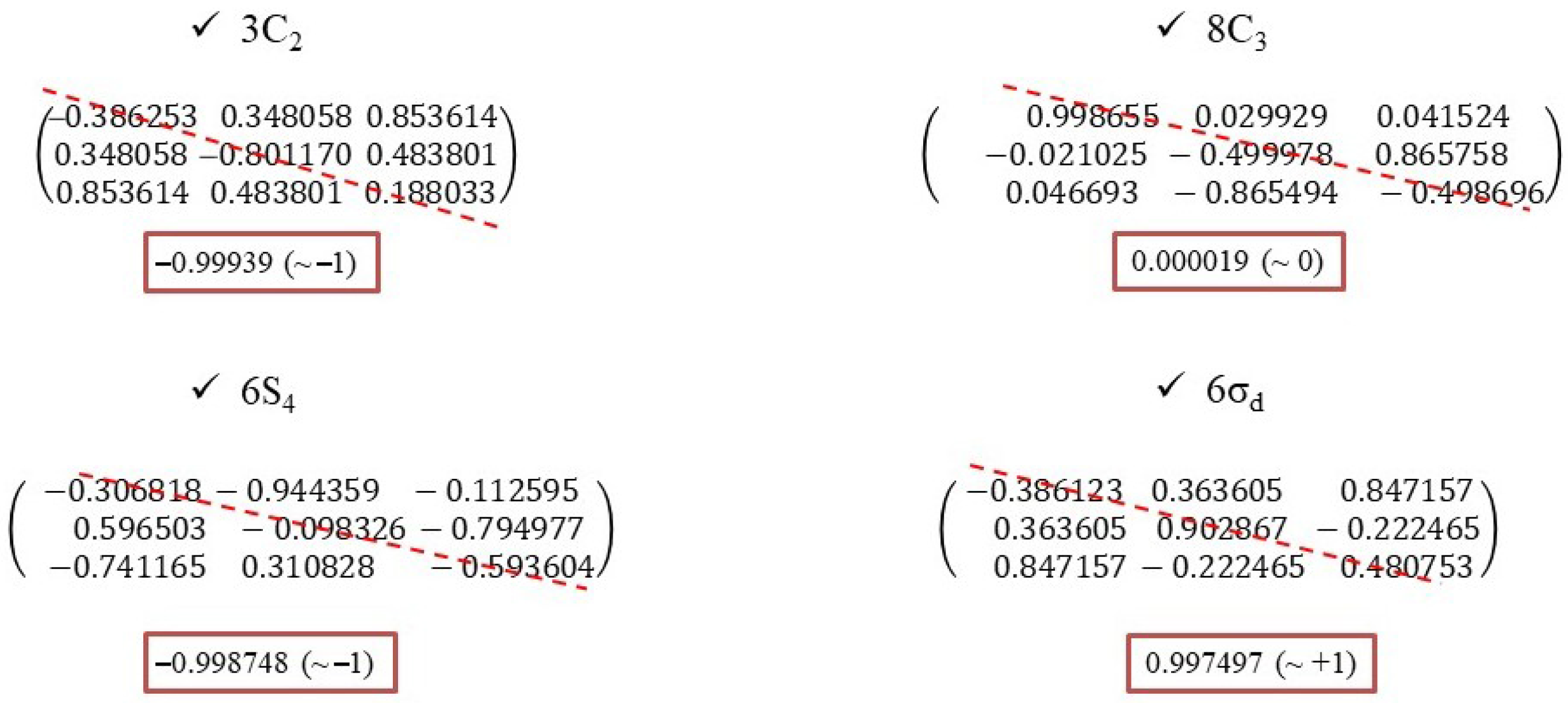 Table 4, we can observe that all states considered represent multidimensional representations describing degenerate states featuring double or triple degeneracy. Moreover, where states are degenerate, any symmetry operators typically mix degenerate eigenvectors. Therefore, for each degenerate triple subspace (first or second), as well as for double degenerate subspace, we have constructed an m × m matrix (i.e., a 3 × 3 or 2 × 2 matrix) of each symmetry operator restricted to these subspaces, as indicated in