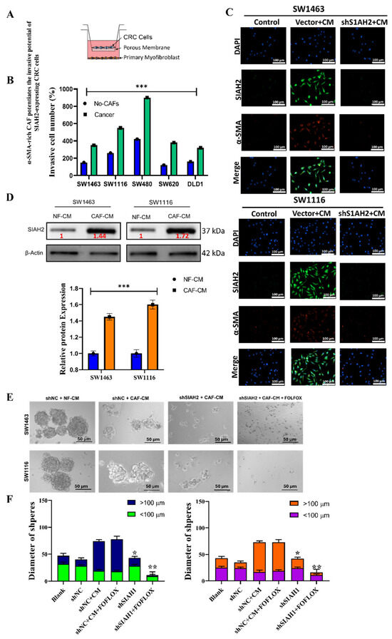 α-SMA-rich CAFs enhance SIAH2-dependent invasion and stem-like properties of colorectal cancer cells. (A) Schematic of the CRC–CAF Transwell co-culture invasion system. (B) CAF co-culture significantly increases invasion of SW1463, SW1116, SW480, SW620, and DLD1 cells (mean ± SEM; ** p < 0.001 vs. no-CAF). (C) Western blot image of CRC cells under the of CAFs, i.e., NF-CM and CAF-CM. (D) Immunofluorescence images showing increased SIAH2 (green) in vector + CM and reduced expression in shSIAH2 + CM groups; nuclei (DAPI, blue), α-SMA (red). Scale bar = 100 µm. (E,F) Sphere formation assays showing that CAF-conditioned medium promotes large spheroid formation (>100 µm), whereas SIAH2 knockdown suppresses spheroid growth and increases fluorouracil, leucovorin, and oxaliplatin (FOLFOX) sensitivity (mean ± SEM; * p < 0.05, ** p < 0.01, *** p < 0.001 vs. shNC + CM).