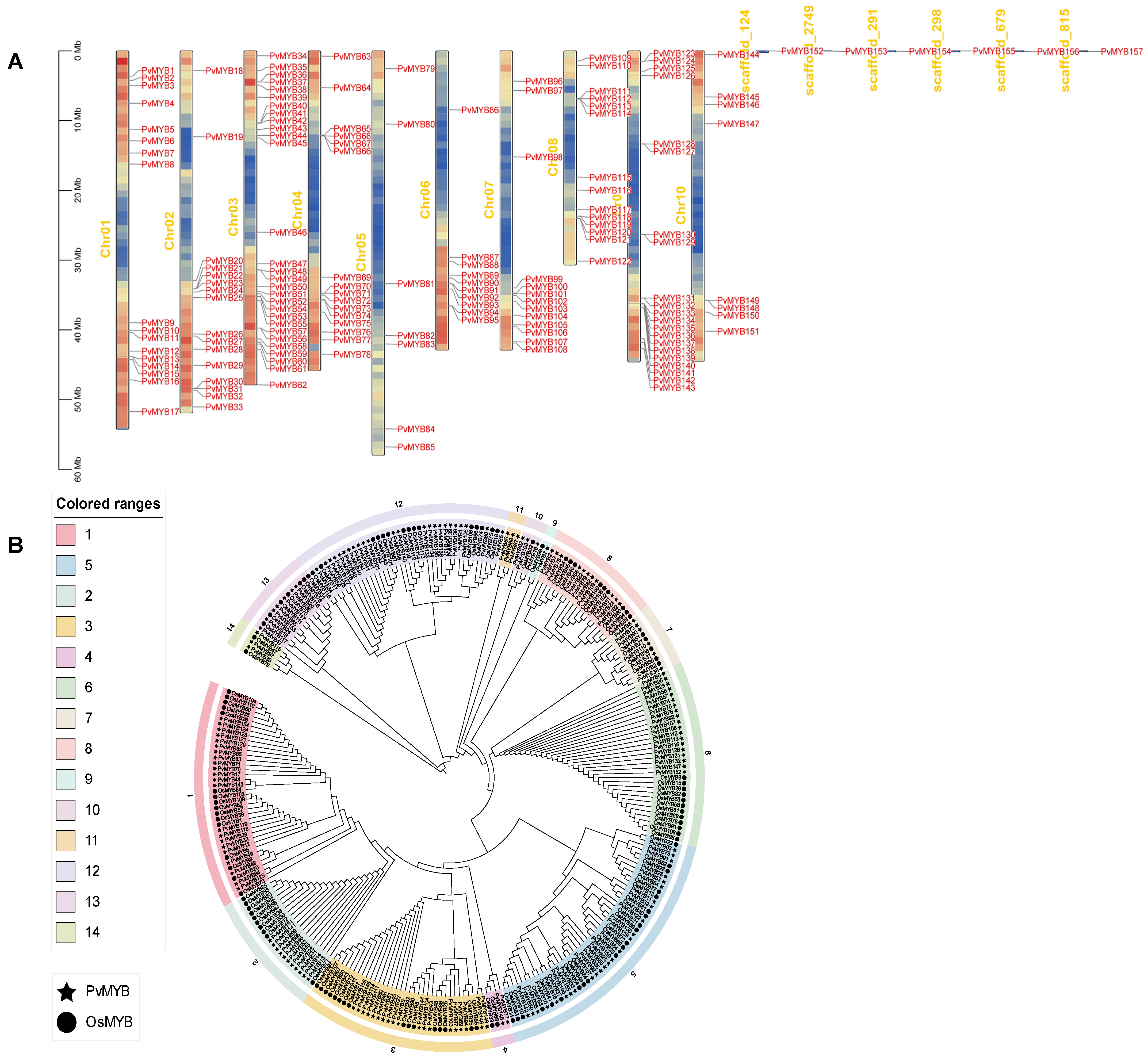 - Zhang, H.; Liu, Z.; Luo, R.; Sun, Y.; Yang, C.; Li, X.; Gao, A.; Pu, J. Genome-Wide Characterization, Identification and Expression Profile of MYB Transcription Factor Gene Family during Abiotic and Biotic Stresses in Mango (Mangifera indica). Plants 2022, 11, 3141. [Google Scholar] [CrossRef]