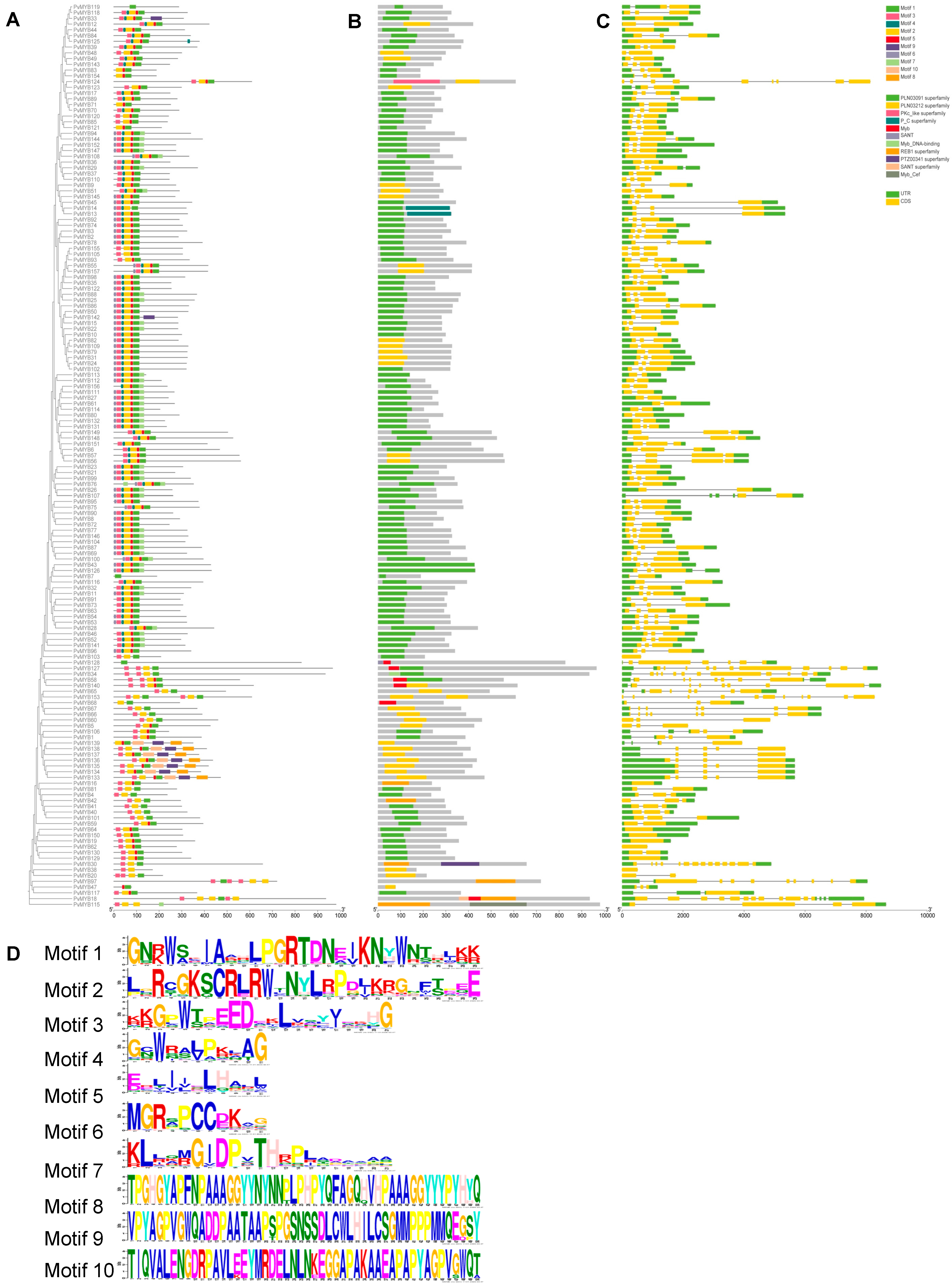 2.2. Conserved Motif Analysis and Domain Visualization of the MYB Gene Family in Seashore Paspalum
