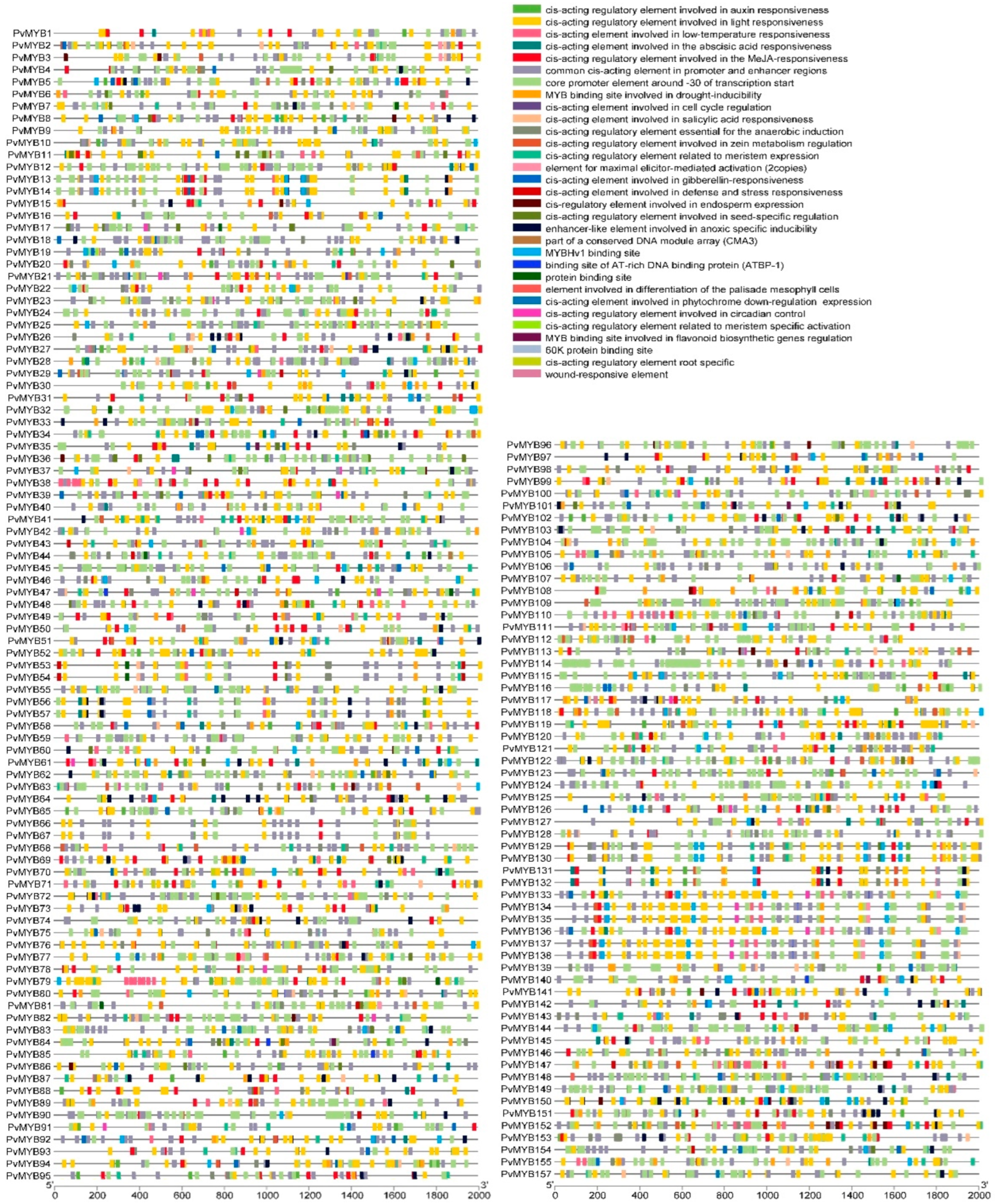 3.2. Regulatory Mechanisms and Cis-Regulatory Elements in PvMYB Genes