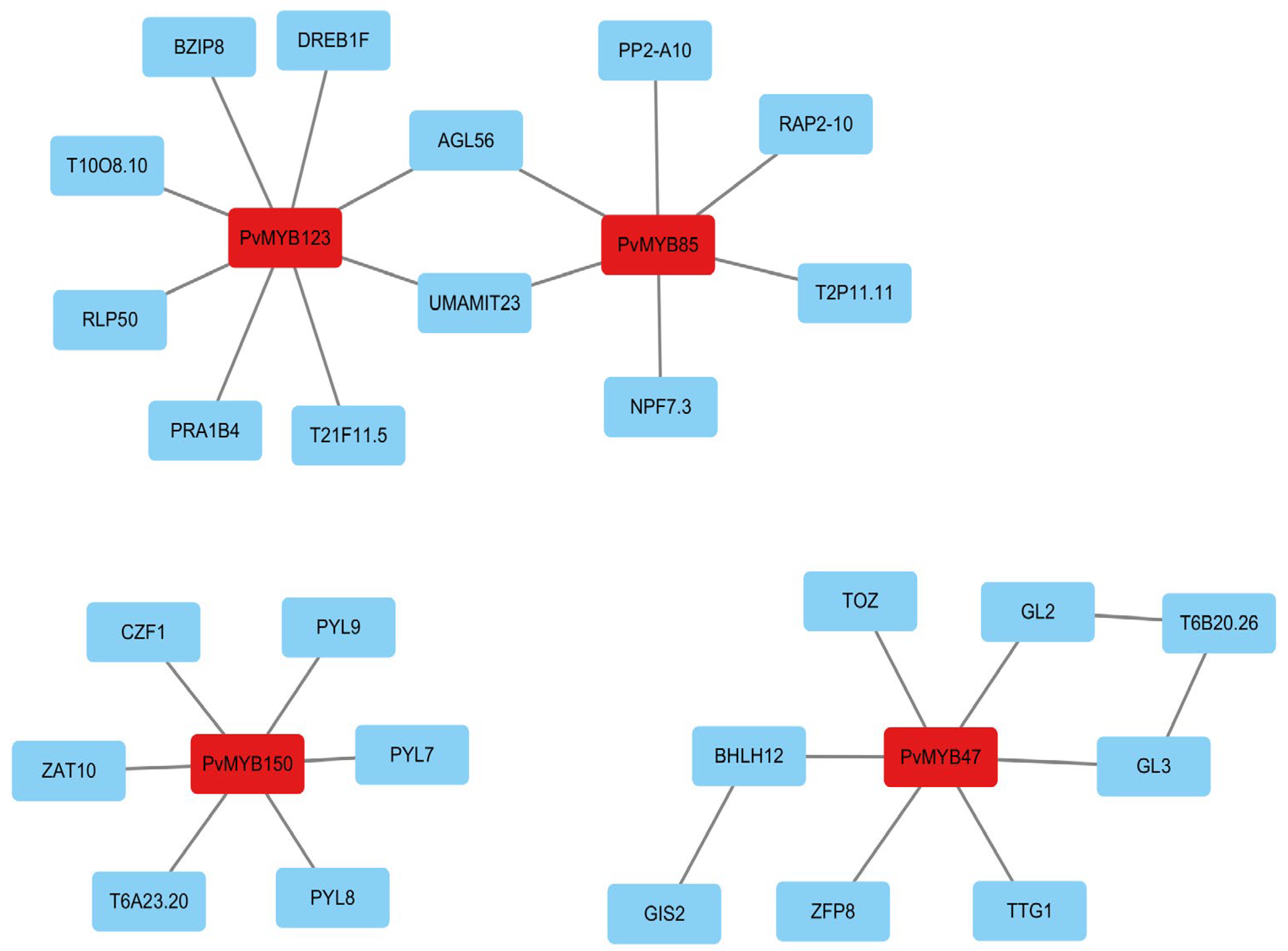 2.6. Prediction of PvMYB Protein–Protein Interaction Network in Seashore Paspalum