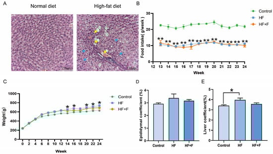 As shown in Figure 1C, the body weights of the three groups were approximately equivalent at the initiation of the experiment. Following prolonged feeding with different diets, the HF group exhibited significantly higher body weight than the control group from week 14 onwards (p < 0.05). In contrast, the HF + F group showed no significant difference in body weight compared with either the HF group or the control group throughout the experimental period. Consistent with the body weight findings, the HF + F group showed no significant reduction in the epididymal fat coefficient (Figure 1D) or liver coefficient (Figure 1E) compared with the HF group. The data corresponding to Figure 1D,E are presented as mean ± standard error of the mean (SEM) in Table S1.