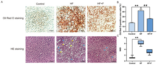 Histopathological analysis of liver tissues revealed distinct patterns across the three groups (Figure 2A, Figure S1 and Figure S2). Oil Red O staining indicated that the HF group had the most severe intracellular lipid deposition. Consistently, Hematoxylin and eosin (HE) staining showed prominent hepatocellular vacuolar degeneration in the same group. In contrast, the HF + F group exhibited a significantly reduced Oil Red O-positive area (p < 0.01, Figure 2B) compared to the HF group. As shown in Figure 2C, no significant difference was demonstrated in the NAFLD Activity Score (NAS) between the HF group and the HF + F group. Consistent with the overall NAS results, the HF + F group also exhibited no significant reduction in the individual scores of steatosis, lobular inflammation, or hepatocyte ballooning compared with the HF group (see detailed grading criteria in Table 1).