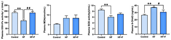 The plasma oxidative stress parameters among the groups were illustrated in Figure 4. Compared with the control group, plasma glutathione peroxidase (GSH-Px) activity (p < 0.01) and plasma superoxide dismutase (SOD) activity (p < 0.01) were notably decreased in the HF group, while plasma 8-hydroxy-2’-deoxyguanosine (8-OHdG) was markedly increased (p < 0.01). These changes were significantly reversed by febuxostat treatment: relative to the HF group, the HF + F group exhibited higher plasma GSH-Px activity (p < 0.01) and a lower 8-OHdG level (p < 0.05).