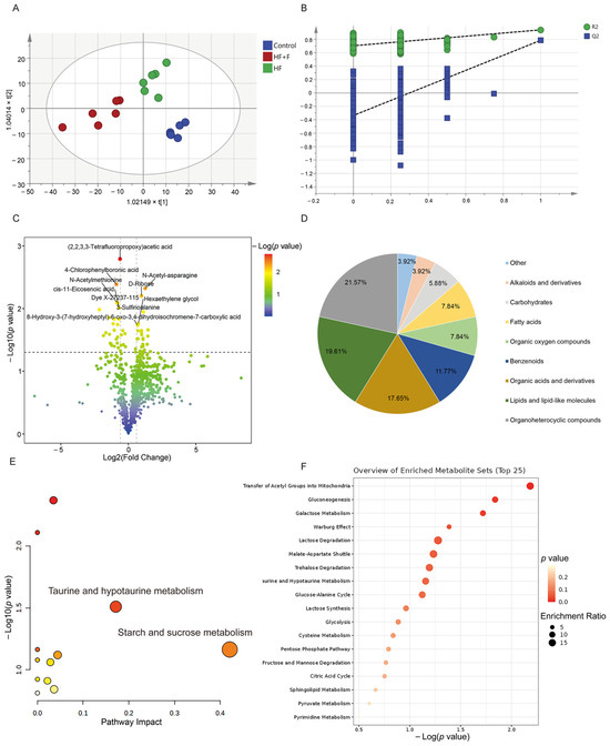 Serum non-targeted metabolomics results. OPLS-DA analysis score chart (A) and OPLS-DA model validation (B) among three groups. A volcano plot (C), including 2, 2, 3, 3-Tetrafluoropropoxy)acetic acid, 4-Chlorophenylboronic acid, N-Acetyl-asparagine, 3-Sulfinoalanine, N-Acetylmethionine, Dye X-27237-115, cis-11-Eicosenoic acid, Anacardic acid, 8-Hydroxy-3-(7-hydroxyheptyl)-6-oxo-3, 4, dihydroisochromene-7-carboxylic acid, D-Ribose, and so on. A classification pie chart (D) between HF + F group and HF group. Metabolic pathway analysis (E) of 51 differential metabolites. Color coding: Dot color scales with −log10 (p value), where redder dots denote higher significance and whiter dots denote lower. Enrichment analysis (F) of 51 differential metabolites. n = 6 per group.