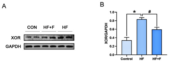 The protein expression of XOR in liver. (A) Representative immunoblot of proteins of the XOR protein. Relative expression of (B) XOR normalized to Glyceraldehyde-3-Phosphate Dehydrogenase (GAPDH). n = 6 per group. Bars represent mean ± SEM. Statistical analyses were performed using one-way ANOVA followed by Tukey’s post hoc test. * p < 0.05. # p < 0.05.