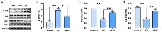 As demonstrated by Western blot (WB) analysis (Figure 6), hepatic XOR protein expression was significantly down-regulated in the HF + F group compared with the HF group (p < 0.05). To further elucidate the molecular mechanisms underlying the effects of febuxostat against MASLD, additional WB analysis (Figure 7) revealed that the hepatic phosphorylated c-Jun N-terminal kinase (p-JNK) protein expression ratio was notably decreased in the HF + F group relative to the HF group (p < 0.05). Conversely, marked upregulation of the expression of NRF2 and HO-1—two downstream proteins—was observed (p < 0.01).