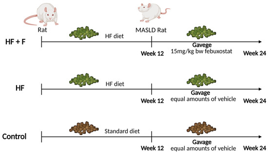 Twenty-four male Sprague–Dawley (SD) rats (6–8 weeks old, 200 ± 20 g) were obtained from the Experimental Animal Center of Ningxia Medical University (IACUC license number: NYLAC-2021-192). The rats were housed in a specific-pathogen-free (SPF) environment maintained at 22 ± 1 °C with 50% relative humidity and a 12 h light/12 h dark cycle. Based on their initial body weights, the rats were randomly allocated to three experimental groups, as outlined in the experimental design (Figure 8). Specifically, these groups included a control group (Control, n = 8) fed a standard rodent chow (Xietong Pharmaceutical Science and Engineering Co., Ltd., Beijing, China); a high-fat diet group (HF, n = 8); and a high-fat diet + febuxostat group (HF + F, n = 8). The latter two groups were administered a purified high-fat rodent chow (MD12033, Medicience Ltd., Yangzhou, China). The detailed macronutrient composition (carbohydrates, lipids, and proteins) of all experimental diets is provided in the Supplementary Materials (Supplementary S5). Throughout the entire experimental period, all rats had free access to food and water (with no modifications to the dietary composition or source) and were weighed weekly.