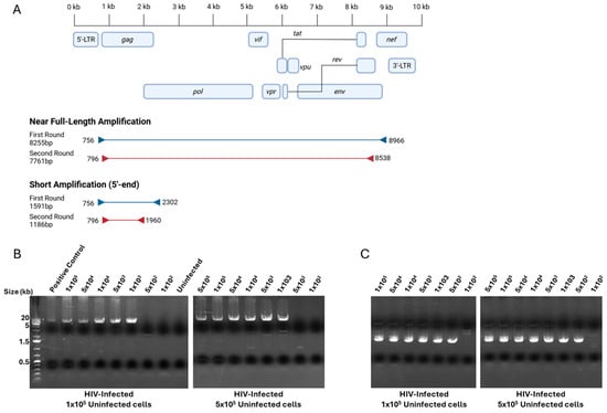 PCR amplification strategy and detection limits. (A) Representation of primers and amplicon sizes for first- and second-round short and near full-length amplification; primer coordinates are based on HXB2 reference sequence. Created in BioRender. Bruchey, W. (2026) https://BioRender.com/fr4repk (accessed on 12 December 2025). (B) Agarose gel images presenting detection limits of nested PCR amplification of near full-length primer sets. Ratios of NL4-3.Luc.E- infected cells ranging from 1 × 102 to 1 × 105 cells spiked in 1 × 105 and 5 × 105 uninfected CD4+ T cells. (C) Representation of primers selected for first- and second-round short amplification. Ratios of NL4-3.Luc.E- infected cells ranging from 1 × 102 to 1 × 105 cells spiked in 1 × 105 and 5 × 105 uninfected CD4+ T cells.