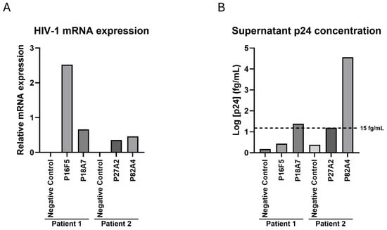 We next sought to establish whether LTR transcriptional activity was retained in our in vitro culture conditions for those four HIV-1-positive cells, despite the observed mutations and deletions. Total RNA was extracted, and the total HIV-1 mRNA levels were measured as described in the Methods section, while the GADPH levels were used as internal controls; HIV-1-negative immortalized CD4+ T-cells from each patient were used as negative controls (Figure 4A). We determined that all four proviruses displayed transcriptional activity in immortalized cells, while no measurable viral mRNA could be detected from either negative control. Notably, of those four infected cells, P16F5 showed the highest level of transcriptional activity. Further investigation into LTR activation, including into potential mutations affecting transcription factor response elements as well as presence and functionality of regulatory proteins would be needed to explain these differences. Furthermore, we wanted to determine whether viral particles could still be found in the culture supernatants, despite the mutations previously described. Therefore, the cells were kept in culture for four weeks in the presence of IL-2 and antiretroviral drugs, after which the supernatants were collected, and the p24 concentrations were assessed using the Simoa technology as described in the Methods section. We found that of the four assessed wells, only two displayed a measurable level of capsid protein in their culture supernatants. The P18A7 p24 levels were just above the assay positivity cutoff at 24.3 fg/mL, while larger quantities of p24 were present in the P82A4 supernatant (36,296.8 fg/mL); neither the P16F5 nor P27A2 p24 levels rose above the 15 fg/mL detection limit (Figure 4B).
