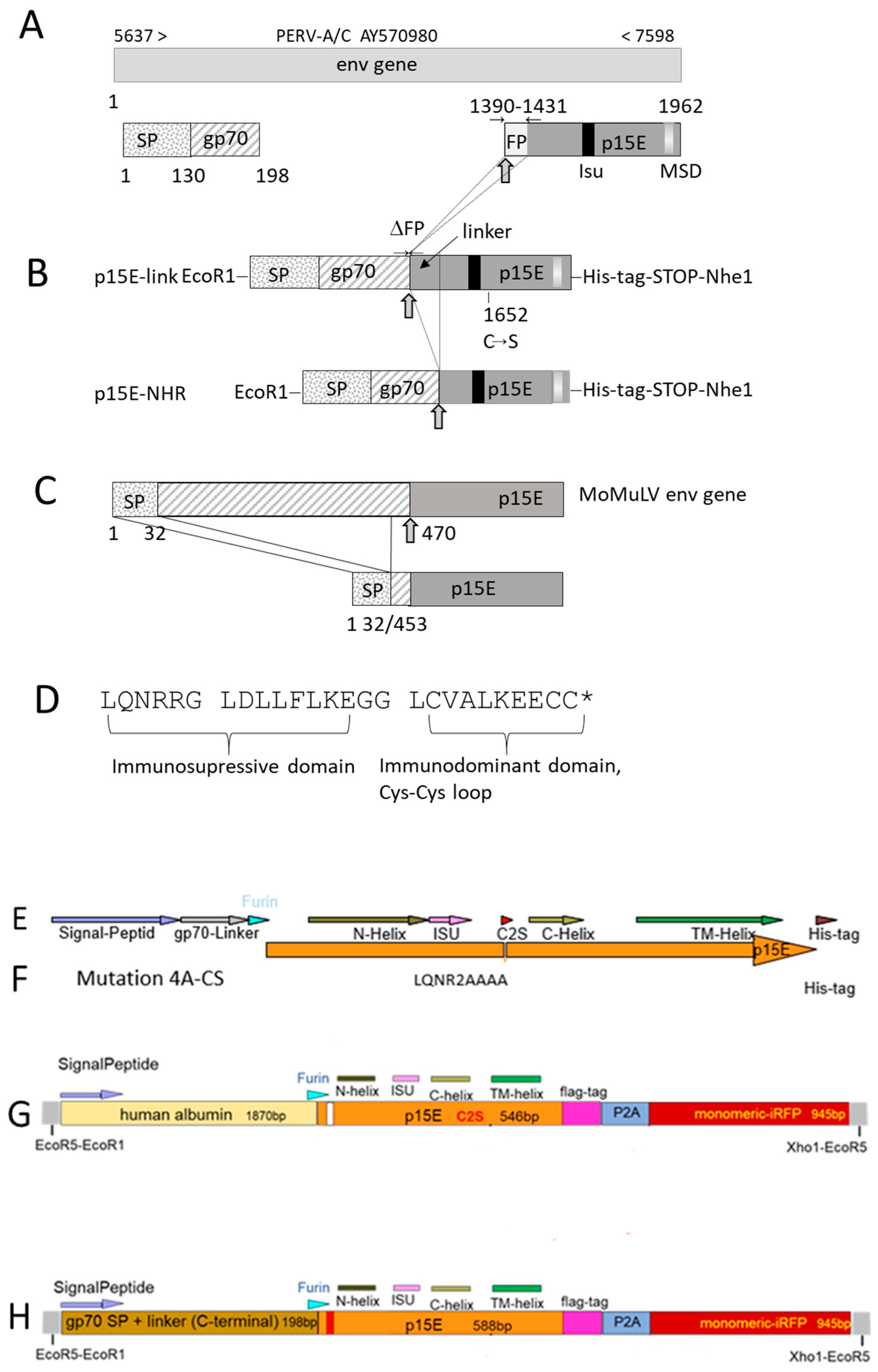 ) indicates the furin peptidase cleavage site, which is positioned after the carboxy-terminal arginine (Arg) residue in the sequence –Arg–X–Lys/Arg–Arg↓– (where Lys is lysine, X is any amino acid, and ↓ identifies the cleavage site). Numbers above entry indicate the nucleotide according to the PERV sequence; numbers below refer to the nucleotide position according to the env gene. (B) Schematic presentation of p15E-link-His and p15E-NHR-His expression constructs. ΔFP, deletion of the fusion peptide coding region; C–S, single-nucleotide exchange at position 1652 that leads to a cysteine-to-serine substitution. (C) Sequence of the full-length Moloney murine leukemia virus (MoMuLV) envelope (env) gene, the signal peptide (SP), and the proteolytic cleavage site at position 470 (arrow) are indicated, and the final p15E sequence is expressed in murine tumor cells as described by Mangeney and Heidmann [23]. (D) Partial sequence of the transmembrane envelope protein of PERV containing the immunosuppressive and immunodominant domains. * indicates the mutated cysteine in p15E-link. (E) This construct corresponds to construct p15E-link-His shown in (B). (F) The same construct as in (E), but with a mutation in the immunosuppressive domain, substituting LQNR into AAAA. (G) A new construct, combining human albumin with p15E, flag-tag, and infrared fluorescent protein (iRFP), (H) A new construct combining a fragment of the surface envelope protein gp70 of PERV with p15E, flag-tag, and iRFP. iRFP, infrared fluorescent protein; N-helix, N-terminal helix; C-helix, C-terminal helix; TM, transmembrane domain; ISU, immunosuppressive domain; furin, furine peptidase cut; 2AP, 2A peptide.